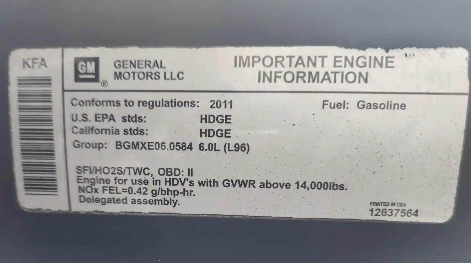 (Used) 2011 GM/Chev (HD) 6.0L, ENGINE ASSEMBLY- Family Number: BGMXE06.0584, Displacement: 6.0L, Horsepower: 360, Serial Number: TBD, E.C.S: SFI, HO2S, TWC, Fuel: Gasoline, For more information about this item, give us a call. We ship Worldwide! (CRG HEAVY TRUCK PARTS) 929 W PULASKI HWY ELKTON, MD 21921, Serial#: TBD, Horse Power: 360