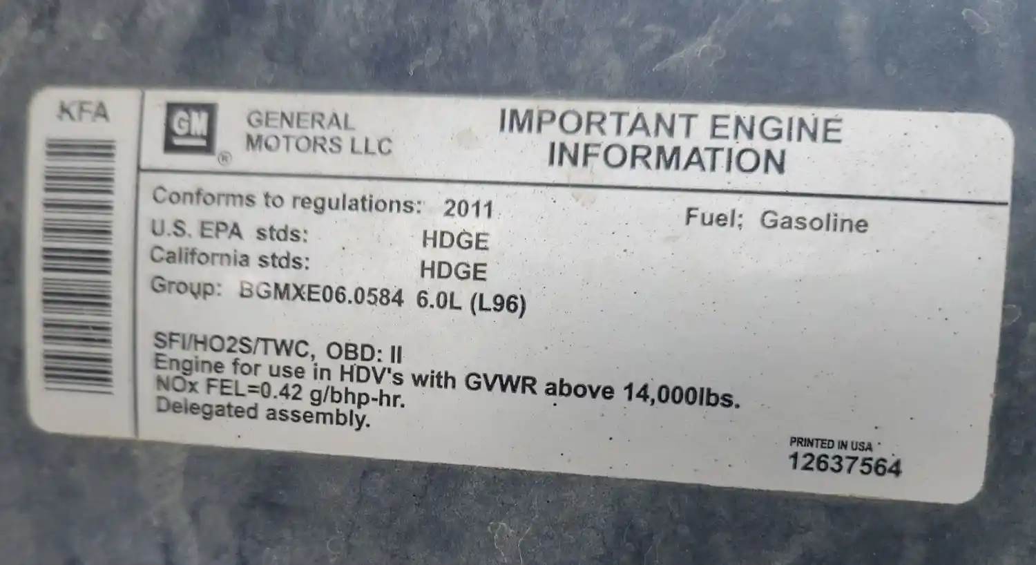 (Used) 2011 GM/Chev (HD) 6.0L, ENGINE ASSEMBLY- Family Number: BGMXE06.0584, Displacement: 6.0L, Horsepower: 360, Serial Number: TBD, E.C.S: SFI, HO2S, TWC, Fuel: Gasoline, For more information about this item, give us a call. We ship Worldwide! (CRG HEAVY TRUCK PARTS) 929 W PULASKI HWY ELKTON, MD 21921, Serial#: TBD, Horse Power: 360