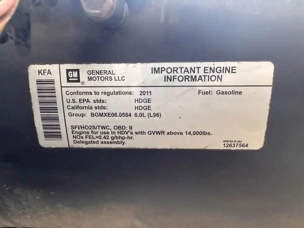 (Used) 2011 GM/Chev (HD) 6.0L, ENGINE ASSEMBLY- Family Number: BGMXE06.0584, Displacement: 6.0L, Horsepower: 360, E.S.N.: N/A, Part Number: 12637564, E.C.S: SFI, HO2S, TWC, Fuel: Gasoline, For more information about this item, give us a call. We ship Worldwide! (CRG HEAVY TRUCK PARTS) 929 W PULASKI HWY, ELKTON, MD 21921, Serial#: N/A, Horse Power: 360