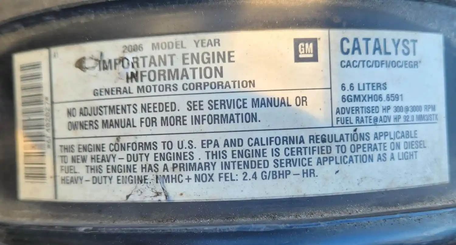 (Used) 2006 GM/Chev (HD) 6.6L, ENGINE ASSEMBLY- Family Number: 6GMXH06.6591, Displacement: 6.6L, Horsepower: 300, Serial Number: 6F402027, E.C.S: CAC, TC, DFI, OC, EGR, For more information about this item, give us a call. We ship Worldwide! (CRG HEAVY TRUCK PARTS) 929 W PULASKI HWY ELKTON, MD 21921, Serial#: 6F402027, Horse Power: 300, Casting#: 6F402027