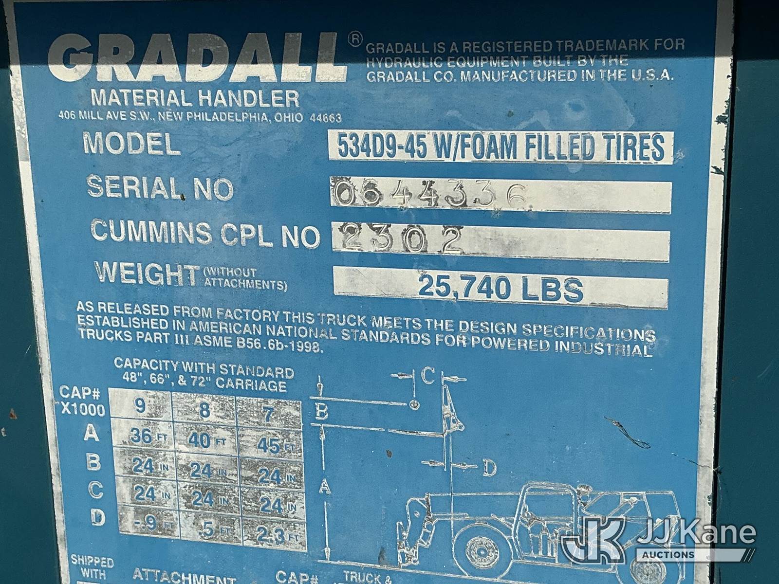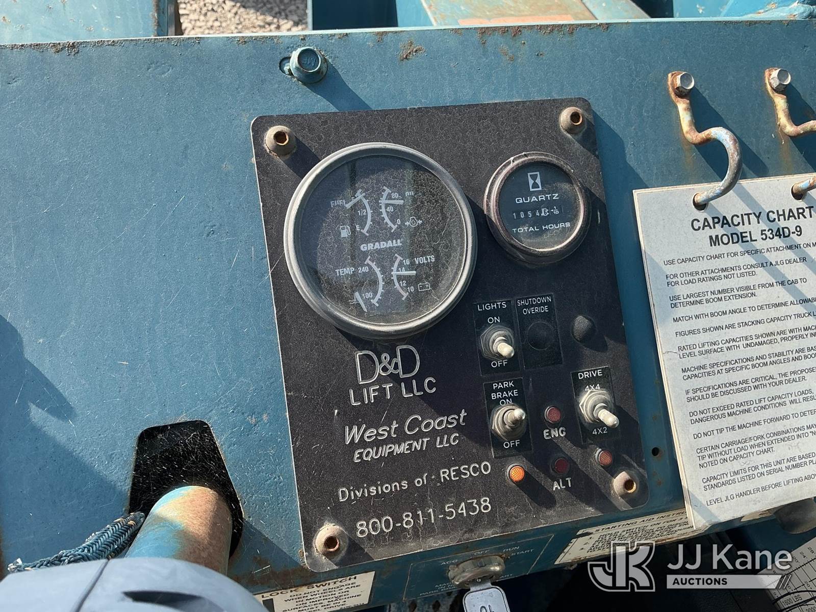 Gradall 534D9-45 Rough Terrain Hydraulic Telescopic Forklift, s/n 0644336, 4-cyl, diesel, (Runs & Operates ) (Reads 1,054 hours) NOTE: This unit is being sold AS IS/WHERE IS via Timed Auction and is located in Dixon, CA. Inspection & preview days for this unit are the 2 business days prior to the first day of items closing for this auction, item is located at 8668 Sparling Ln Dixon, CA 95620 and hours of operations are 8a-4p. For pre-sale questions, please contact JJ Kane Staff at (707) 678-8060 (dixon@jjkane.com). Dealer License Number 45696. (Buyer is responsible for removal. Assistance by consignor or JJ Kane Auctions is not assured.)