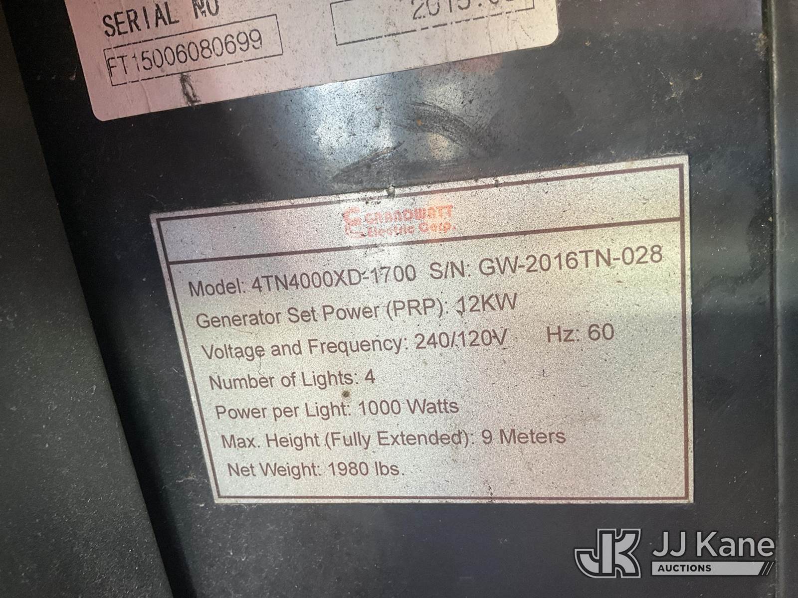 Grandwatt 4TN4000XD Portable Light Tower, s/n GW2016TN028, Kubota diesel, (Not Running, Condition Unknown, Cranks, Jump for Power) (Reads 2,614 hours) NOTE: This unit is being sold AS IS/WHERE IS via Timed Auction and is located in Jefferson, LA. For more information & removal arrangements please contact Darrin Springs @ 816-390-3200. License # LA AB-154 (Buyer is responsible for removal. Assistance by consignor or JJ Kane Auctions is not assured.)