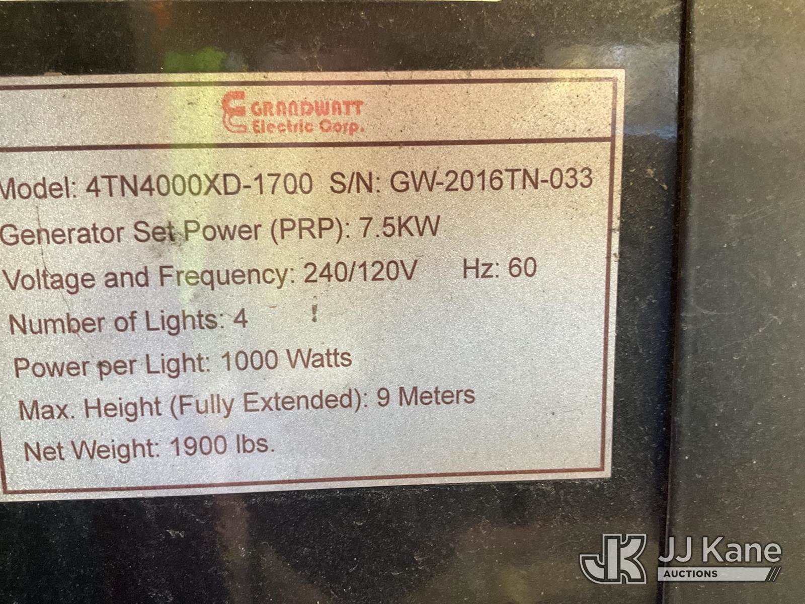 Grandwatt 4TN4000XD Portable Light Tower, s/n GW2016TN033, Kubota diesel, (Not Running, Condition Unknown, Cranks, Jump for Power, Missing Hitch on Tongue) (Reads 1,364 hours) NOTE: This unit is being sold AS IS/WHERE IS via Timed Auction and is located in Jefferson, LA. For more information & removal arrangements please contact Darrin Springs @ 816-390-3200. License # LA AB-154 (Buyer is responsible for removal. Assistance by consignor or JJ Kane Auctions is not assured.)