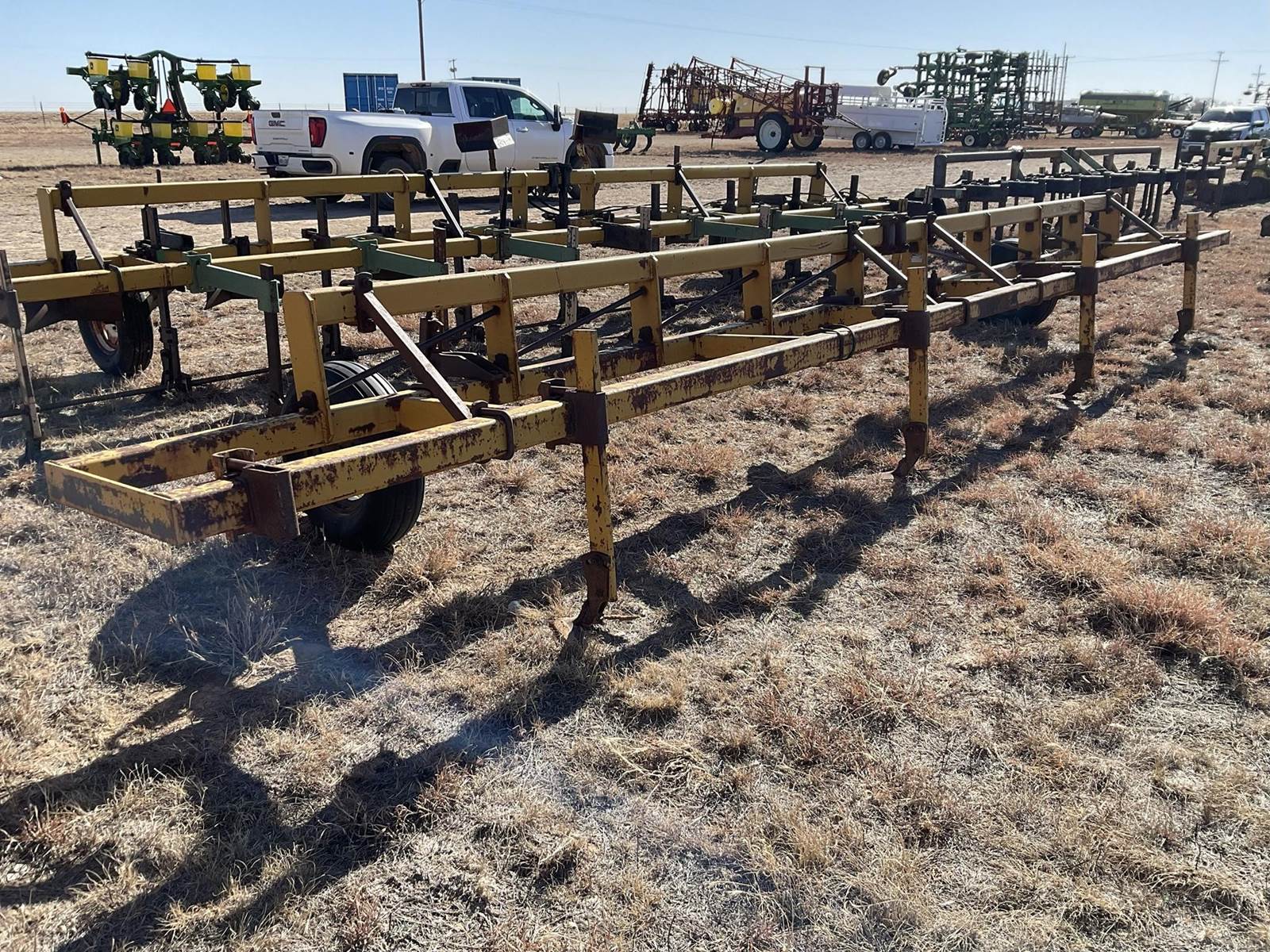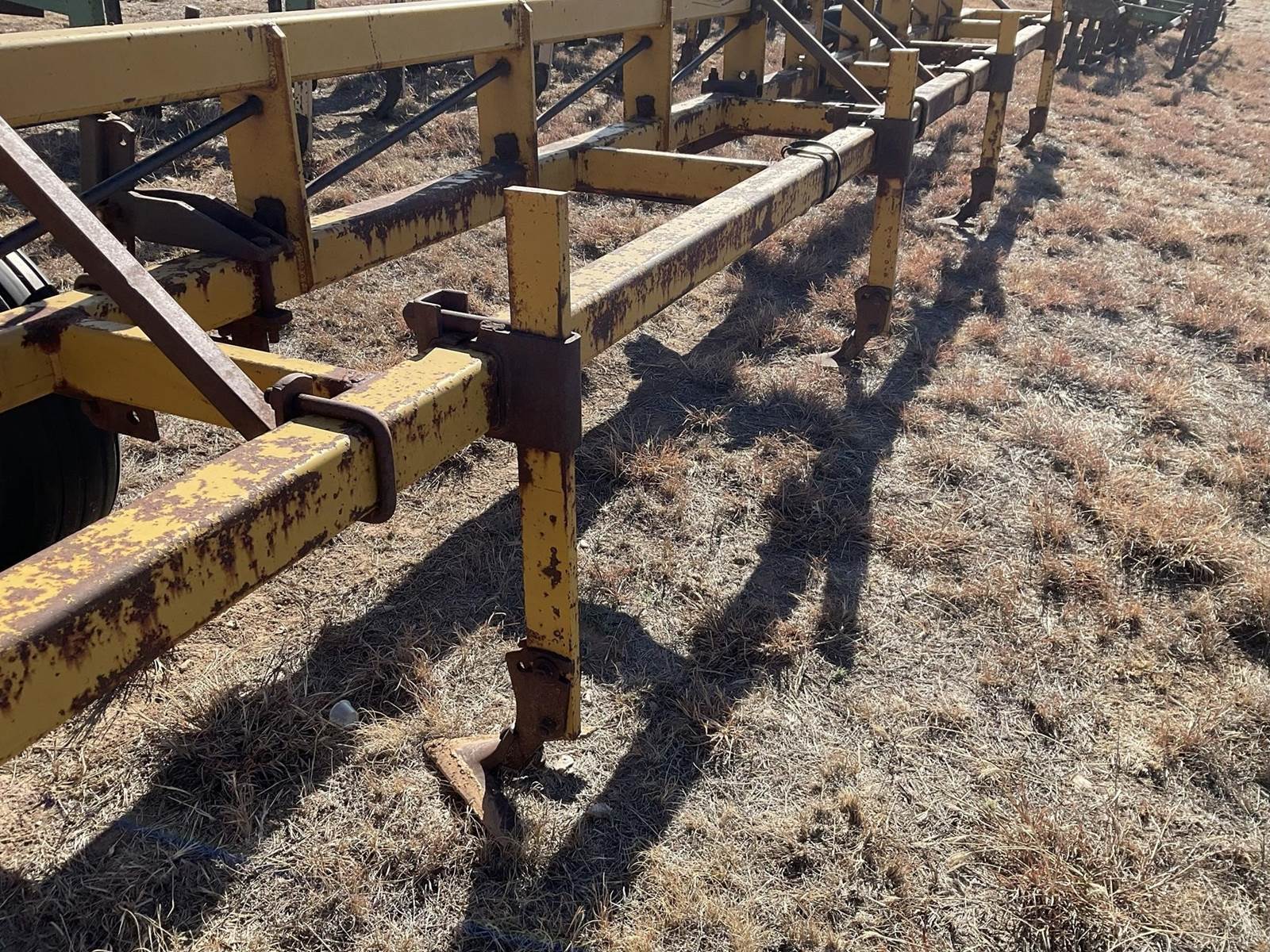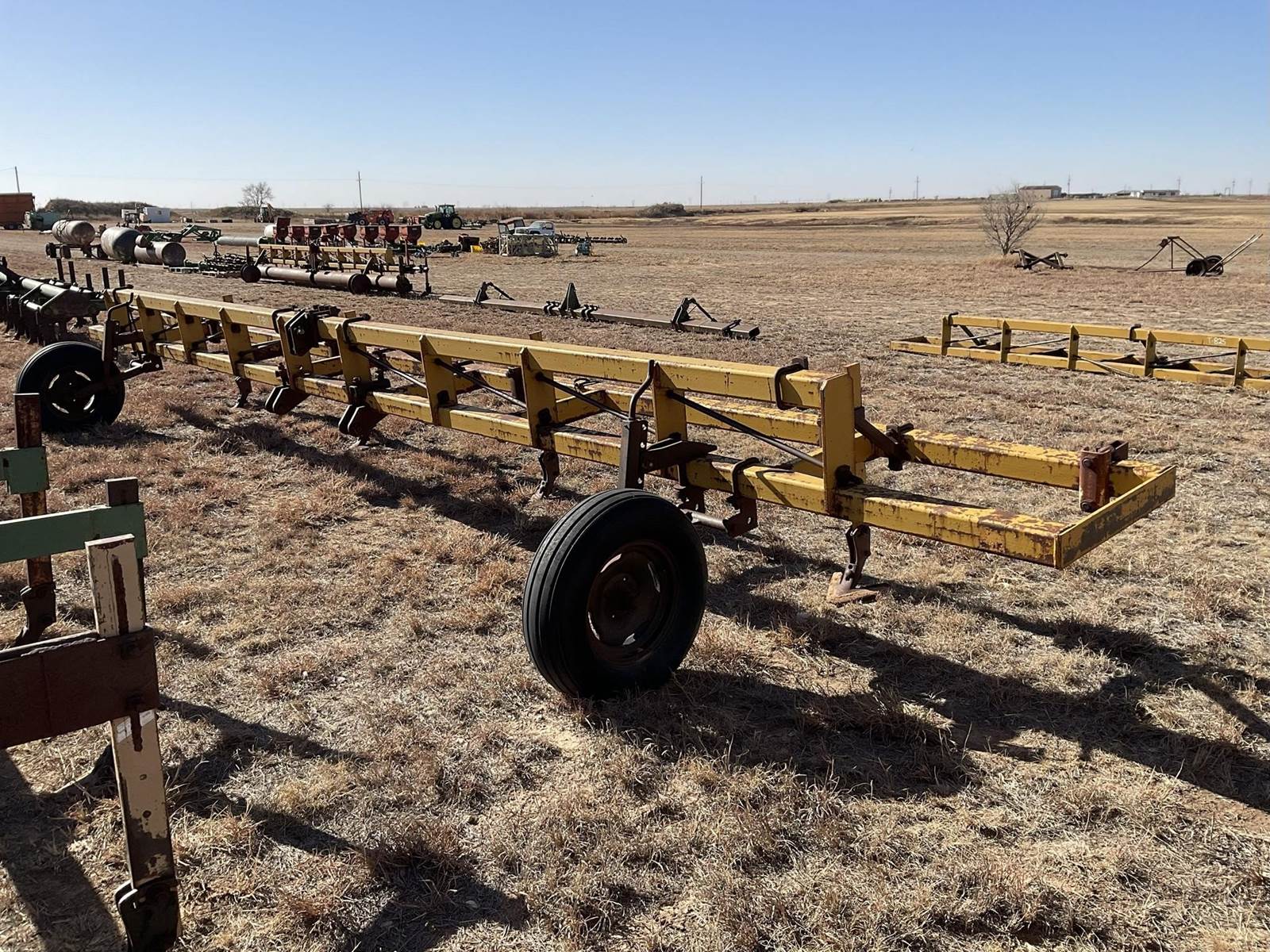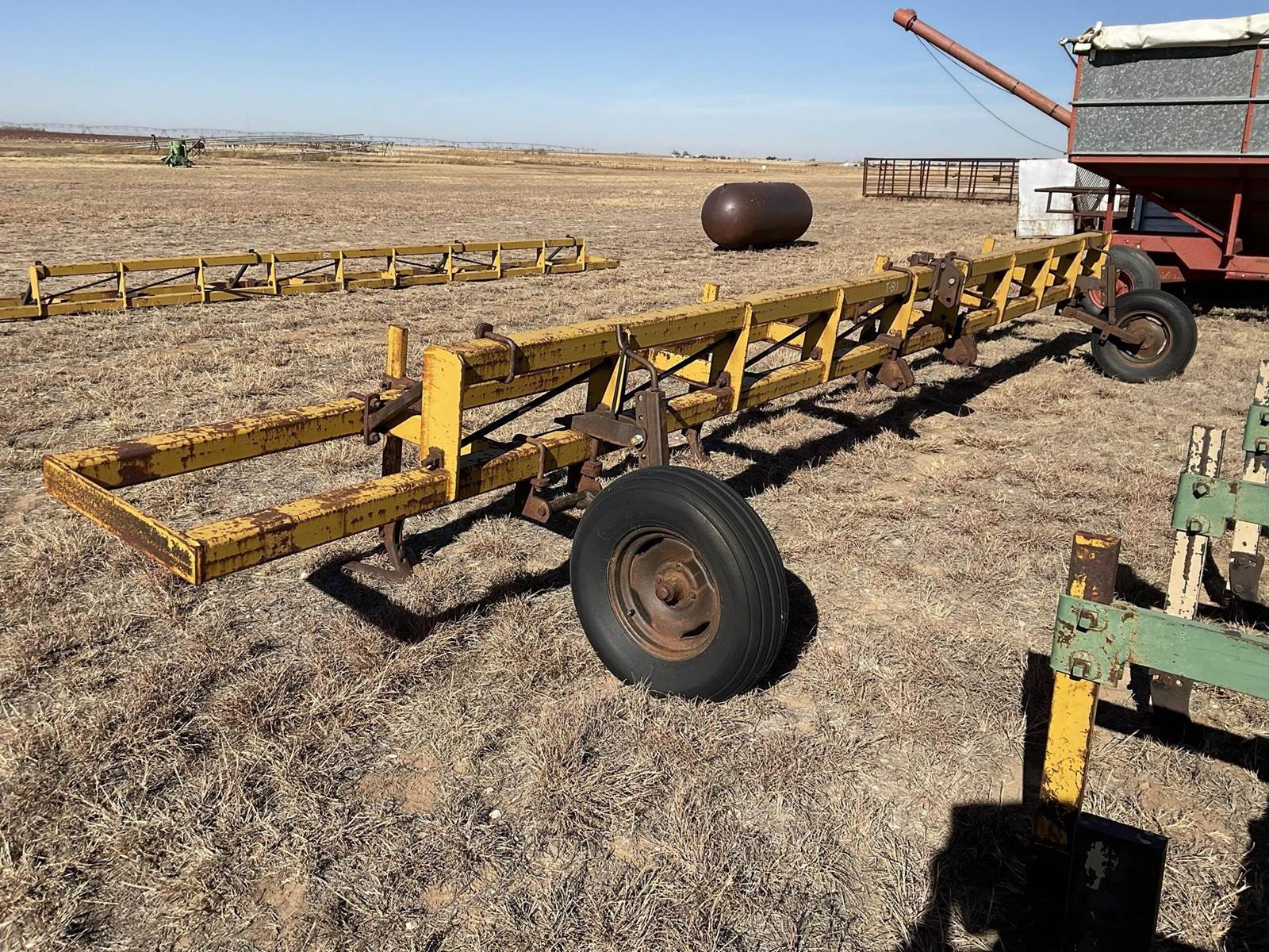 Hamby 28' double 4''x4'' tool bar with gauge wheels up front and four 1''x3'' shanks with sweeps on the back