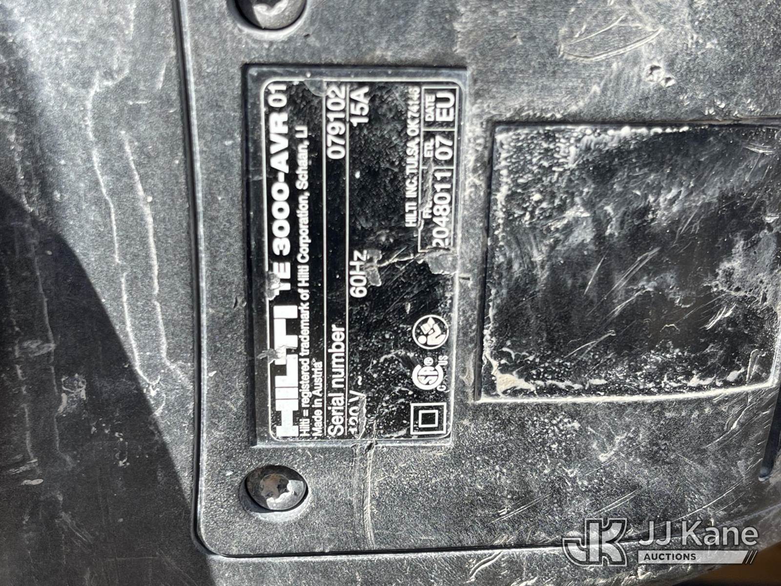 Hilti TE3000-AVR Breaker (Used) NOTE: This unit is being sold AS IS/WHERE IS via Timed Auction and is located in Dixon, CA. Inspection & preview days for this unit are the 2 business days prior to the first day of items closing for this auction, item is located at 8668 Sparling Ln Dixon, CA 95620 and hours of operations are 8a-4p. For pre-sale questions, please contact JJ Kane Staff at (707) 678-8060 (dixon@jjkane.com). Dealer License Number 45696. (Buyer is responsible for removal. Assistance by consignor or JJ Kane Auctioneers is not assured.)