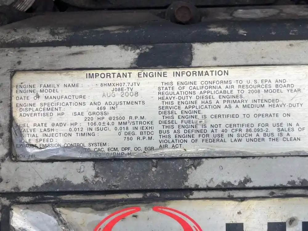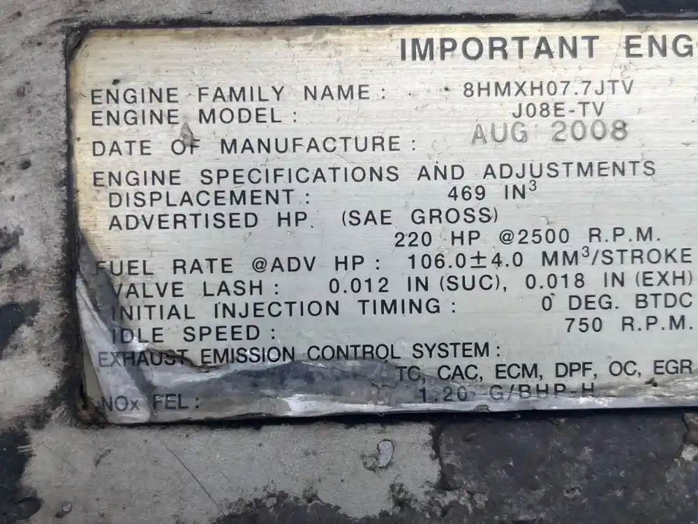 (Used) 2008 Hino J08E-TV, ENGINE ASSEMBLY- Family Number: 8HMXH07.7JTV, Displacement: 7.6L, Horsepower: 220, Serial Number: TBD, E.C.S: TC, CAC, ECM, DPF, OC, EGR, For more information about this item, give us a call. We ship Worldwide! (CRG HEAVY TRUCK PARTS) 929 W PULASKI HWY ELKTON, MD 21921, Serial#: TBD, Horse Power: 220