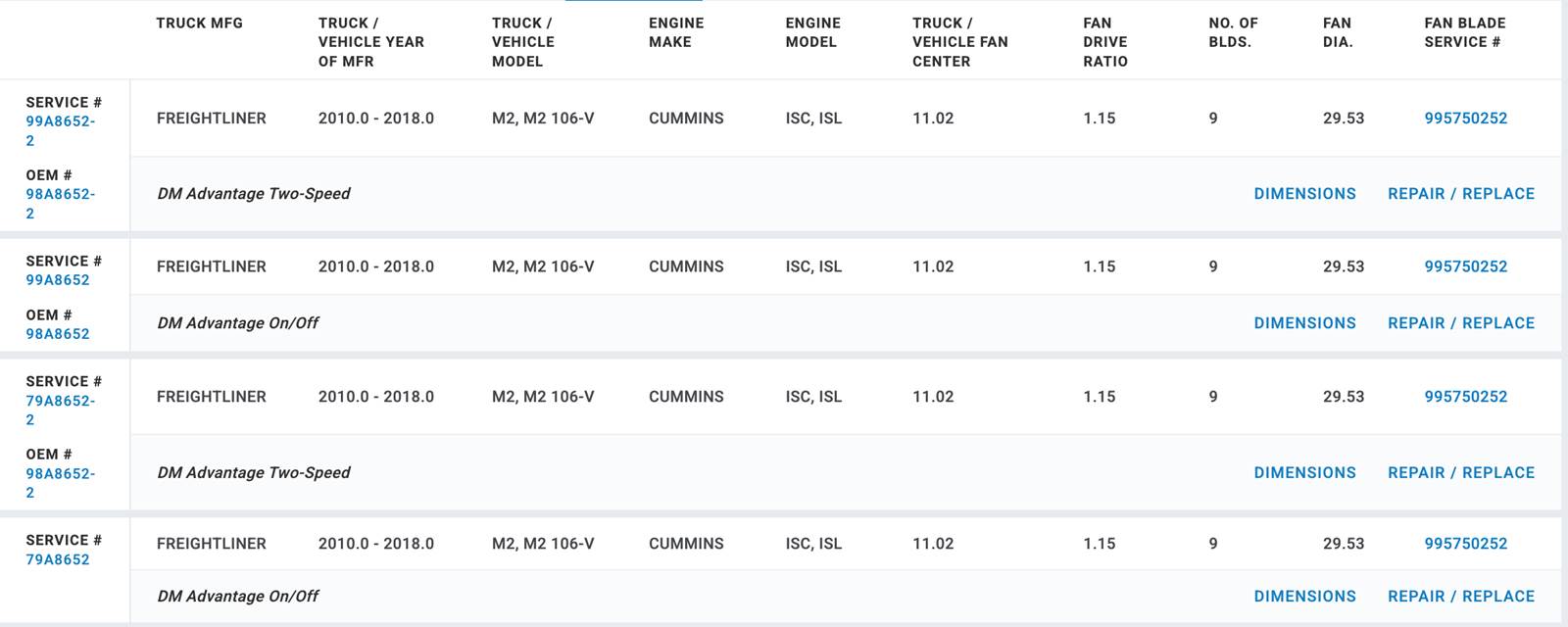 (GOOD USED/ TESTED) Horton OEM Fan Clutch for Cummins ISC, ISL Diesel Engine, for sale!!! Part #: 98A8652; Service #'s: 99A8652-2, 99A8652, 79A8652-2, 79A8652; OEM #'s: 98A8652-2, 98A8652; Freightliner Application: (2010-2018) M2, M2 106-V; Stock #: FC2799 (TAKE A LOOK AT CHART IN PICTURES TO VERIFY IF THIS FAN CLUTCH WORKS FOR YOU!!!!)