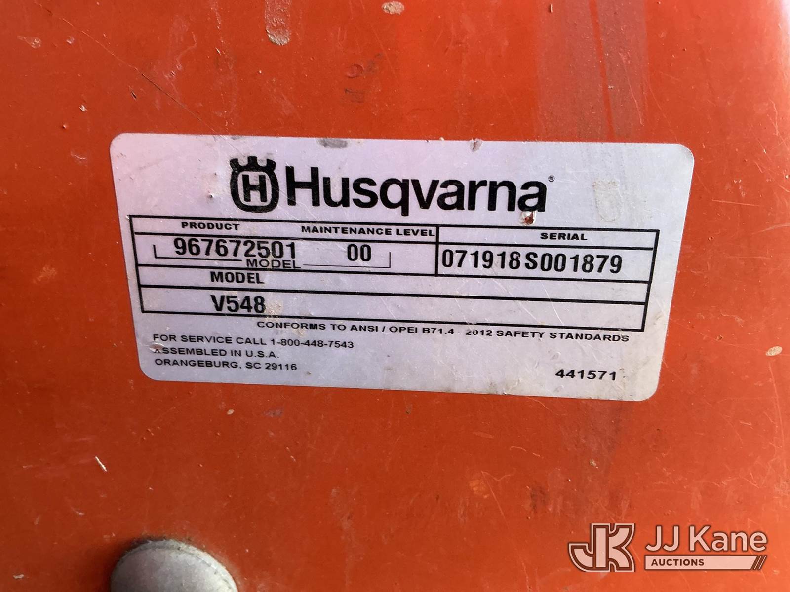 Husqvarna V548 Lawn Mower, s/n 071918S001879, Kawasaki Hydrostatic, Gas, with 48 in deck, (Runs & Moves) (Jump To Start, Mower Not Operating Condition Unknown ) (Reads 2,109 hours) NOTE: This unit is being sold AS IS/WHERE IS via Timed Auction and is located in China Grove, NC. Inspection & preview days for this unit are the 2 business days prior to the first day of items closing for this auction, item is located at 820 E NC Hwy 152 China Grove, NC 28023 and hours of operations are 8a-4p. For pre-sale questions, please contact Office Staff @ (704) 674-1113. (Buyer is responsible for removal. Assistance by consignor or JJ Kane Auctions is not assured.)