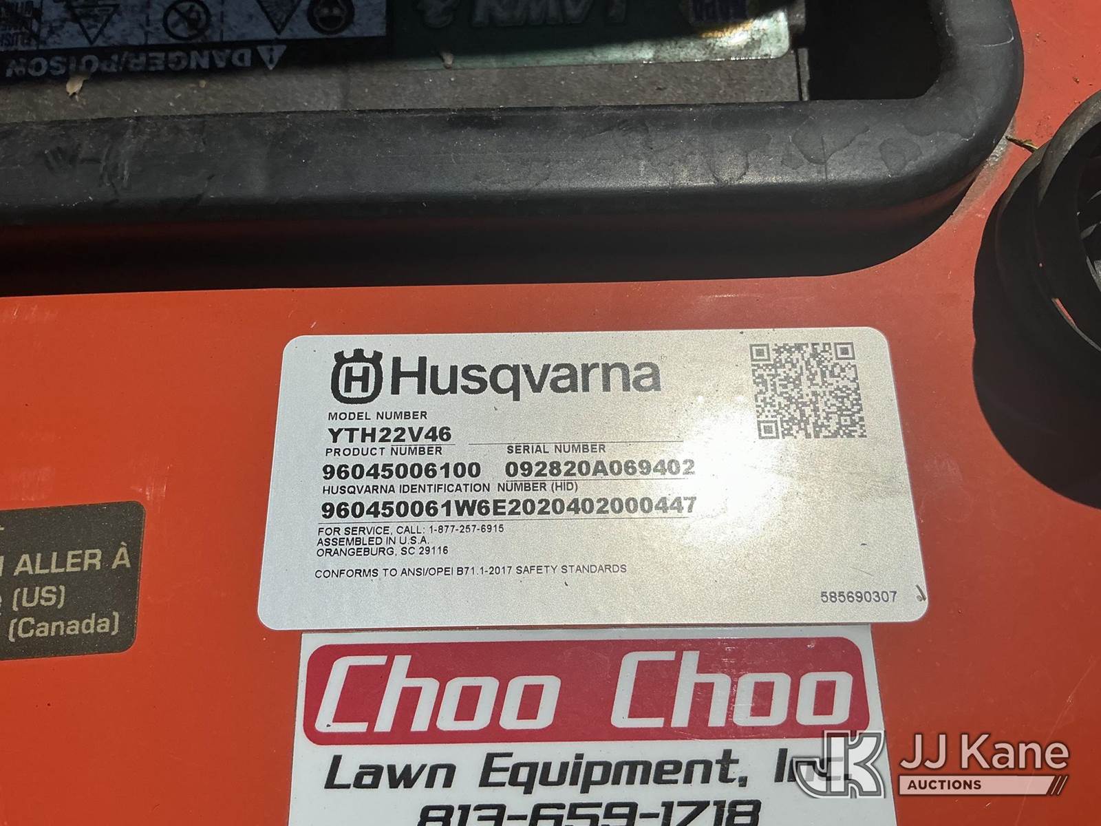 Husqvarna YTH22V46 Riding Lawn Mower with 46 Inch Deck, s/n 092820A069402, Briggs & Stratton Intek 22HP Hydrostatic, Gas, Hillsborough County BOCC Unit (Runs, Moves & Operates) (Reads 498 hours) NOTE: This unit is being sold AS IS/WHERE IS via Timed Auction and is located in Thonotosassa, FL. Inspection & preview days for this unit are the 2 business days prior to the first day of items closing for this auction, item is located at 11720 N US 301 Thonotosassa, Fl 33592 and hours of operations are 8a-4p. For pre-sale questions, please contact Office Staff @ (813) 986-2485. (Buyer is responsible for removal. Assistance by consignor or JJ Kane Auctioneers is not assured.)