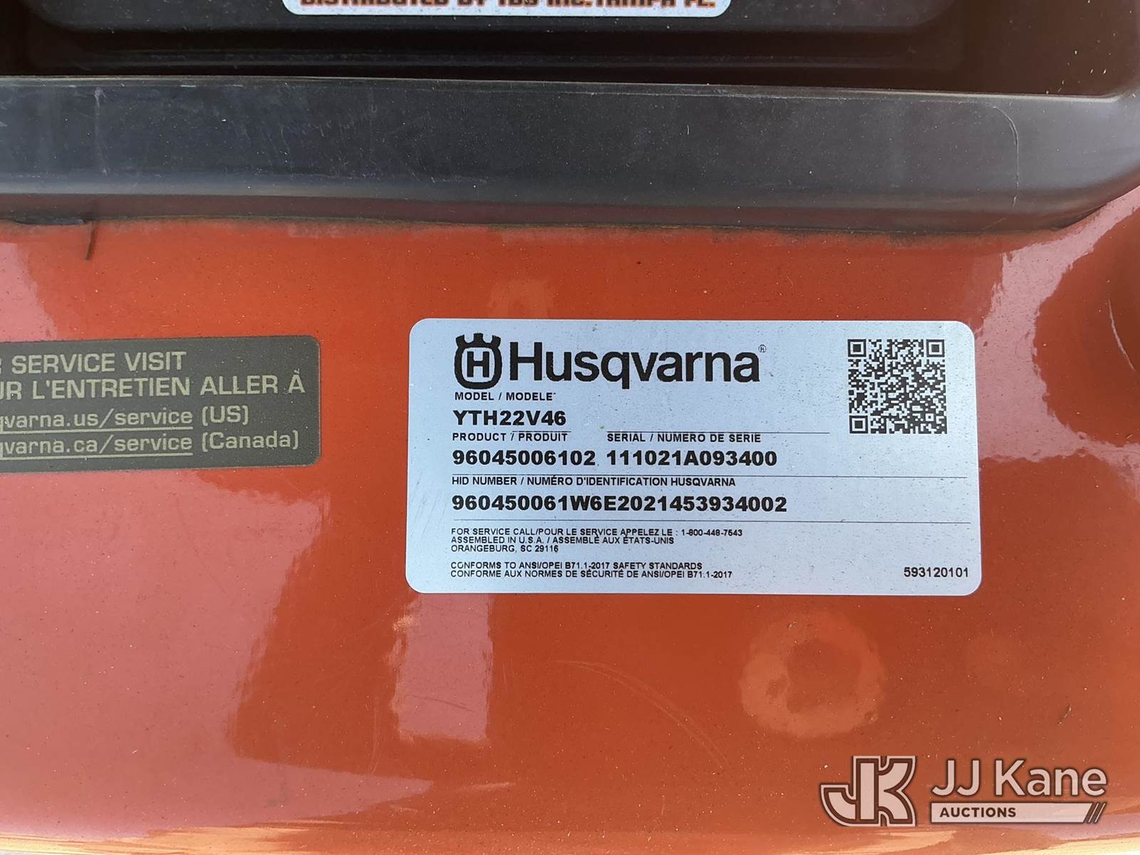 Husqvarna YTH22V46 Riding Lawn Mower with 46 Inch Deck, s/n 111021A093400, Briggs & Stratton EXI 22 HP Hydrostatic, Gas, Hillsborough County BOCC Unit (Runs, Moves & Operates) (Reads 199 hours) NOTE: This unit is being sold AS IS/WHERE IS via Timed Auction and is located in Thonotosassa, FL. Inspection & preview days for this unit are the 2 business days prior to the first day of items closing for this auction, item is located at 11720 N US 301 Thonotosassa, Fl 33592 and hours of operations are 8a-4p. For pre-sale questions, please contact Office Staff @ (813) 986-2485. (Buyer is responsible for removal. Assistance by consignor or JJ Kane Auctioneers is not assured.)