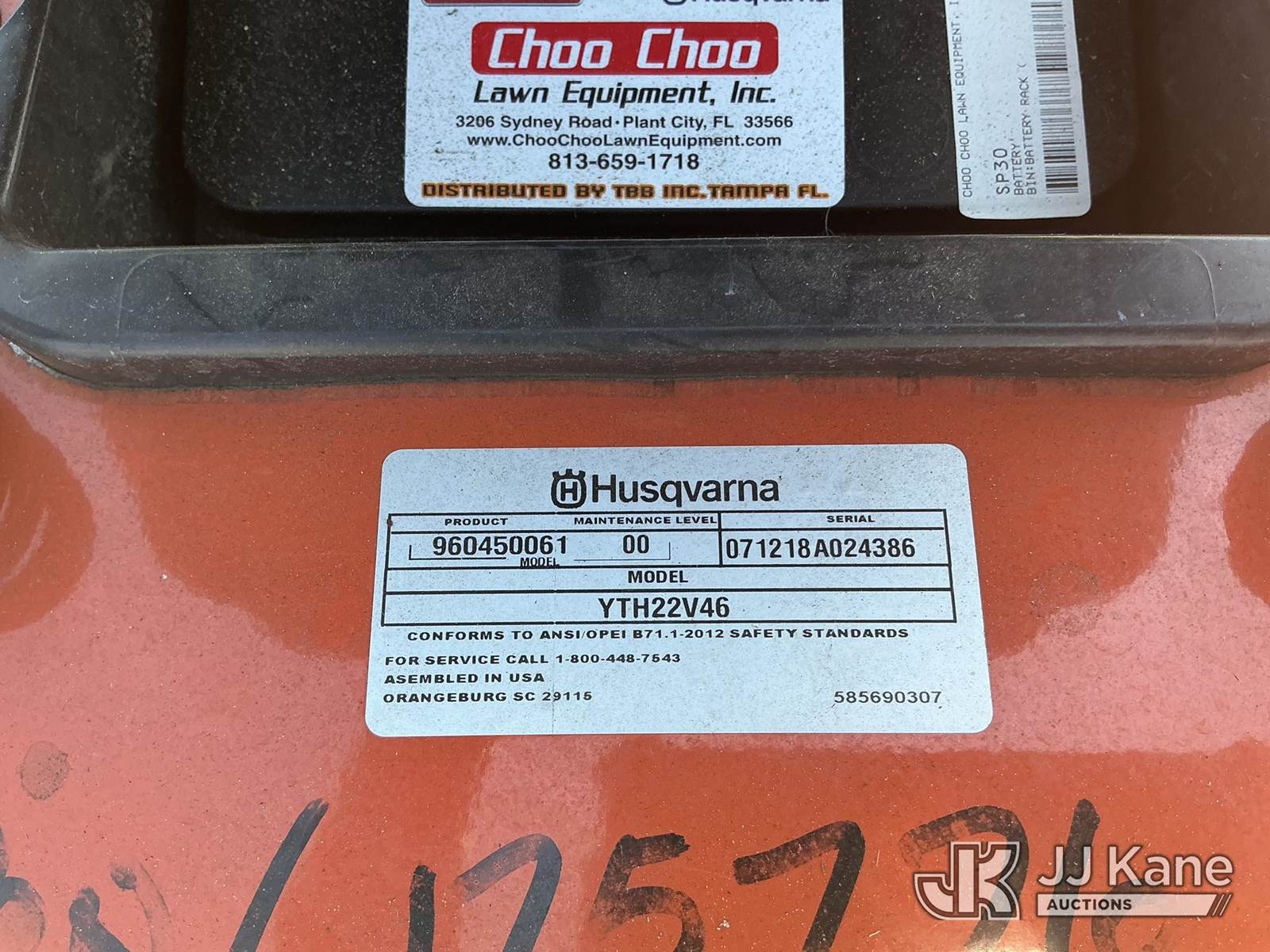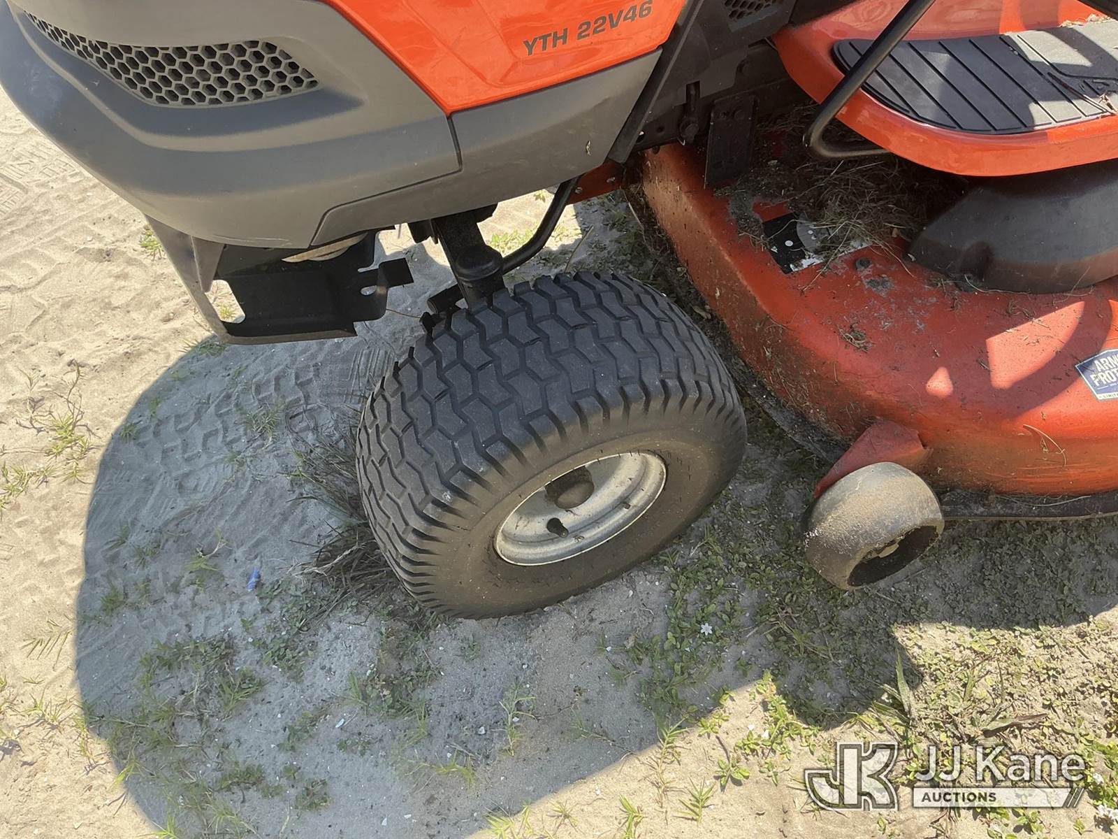 Husqvarna YTH22V46 Riding Lawn Mower with 46 Inch Deck, s/n 071218A024386, Briggs & Stratton Intek 22 HP Hydrostatic, Gas, Hillsborough County BOCC Unit (Runs, Moves & Operates) (Reads 599 hours) NOTE: This unit is being sold AS IS/WHERE IS via Timed Auction and is located in Thonotosassa, FL. Inspection & preview days for this unit are the 2 business days prior to the first day of items closing for this auction, item is located at 11720 N US 301 Thonotosassa, Fl 33592 and hours of operations are 8a-4p. For pre-sale questions, please contact Office Staff @ (813) 986-2485. (Buyer is responsible for removal. Assistance by consignor or JJ Kane Auctioneers is not assured.)