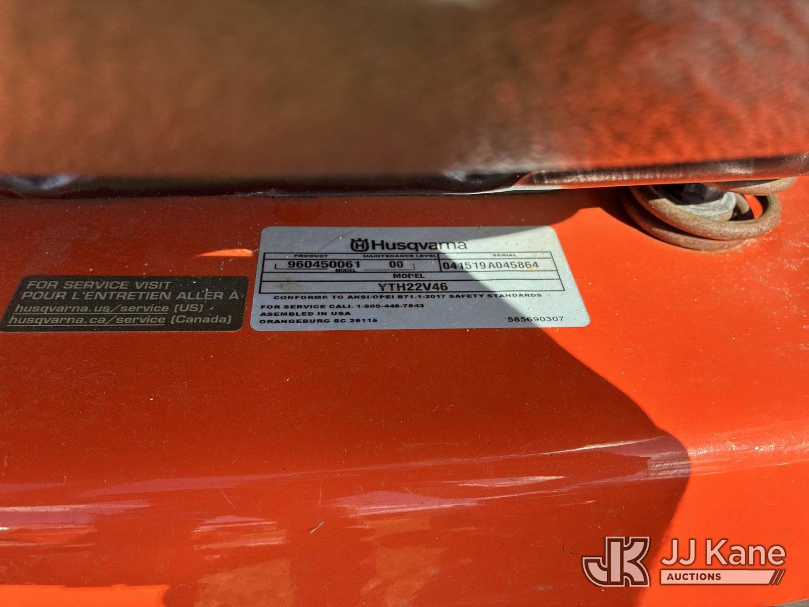 Husqvarna YTH22V46 Riding Lawn Mower with 46 Inch Deck, s/n 041519A045864, Briggs & Stratton Hydrostatic, Gas, Hillsborough County BOCC Unit (Runs, Moves & Operates) (Reads 594 hours) NOTE: This unit is being sold AS IS/WHERE IS via Timed Auction and is located in Thonotosassa, FL. Inspection & preview days for this unit are the 2 business days prior to the first day of items closing for this auction, item is located at 11720 N US 301 Thonotosassa, Fl 33592 and hours of operations are 8a-4p. For pre-sale questions, please contact Office Staff @ (813) 986-2485. (Buyer is responsible for removal. Assistance by consignor or JJ Kane Auctioneers is not assured.)