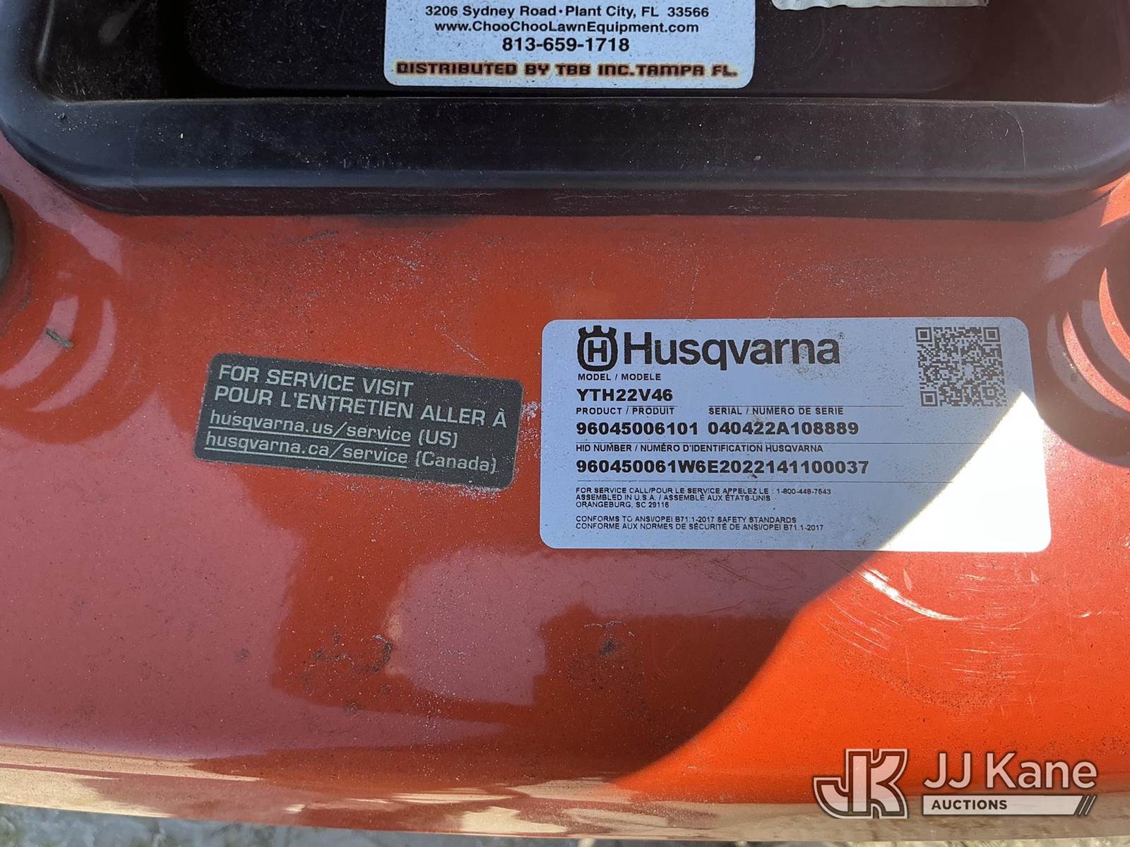 Husqvarna YTH22V46 Riding Lawn Mower with 46 Inch Deck, s/n 040422A108889, Briggs & Stratton EXI 22 HP Hydrostatic, Gas, Hillsborough County BOCC Unit (Runs, Moves & Operates) (Reads 301 hours) NOTE: This unit is being sold AS IS/WHERE IS via Timed Auction and is located in Thonotosassa, FL. Inspection & preview days for this unit are the 2 business days prior to the first day of items closing for this auction, item is located at 11720 N US 301 Thonotosassa, Fl 33592 and hours of operations are 8a-4p. For pre-sale questions, please contact Office Staff @ (813) 986-2485. (Buyer is responsible for removal. Assistance by consignor or JJ Kane Auctioneers is not assured.)