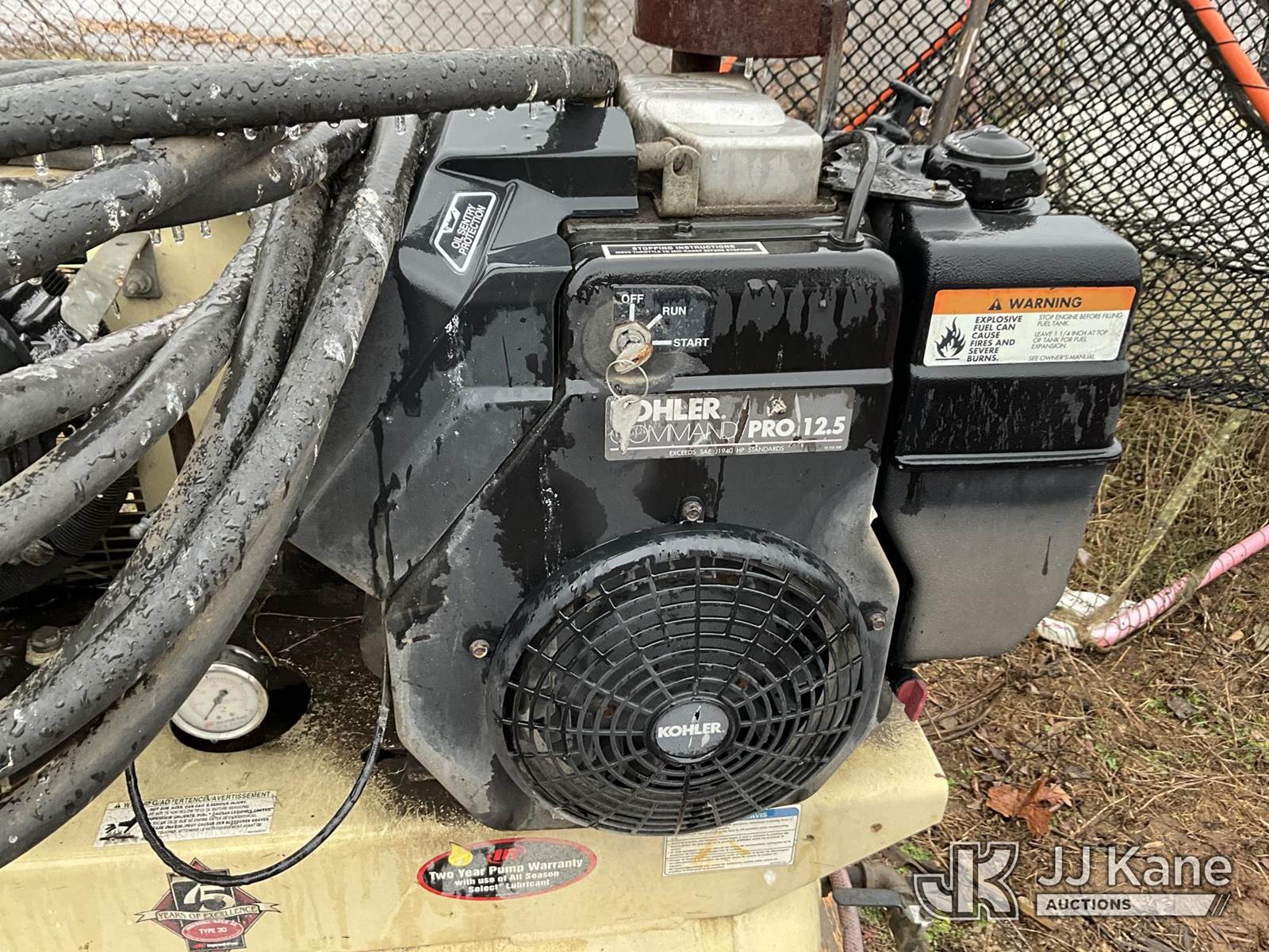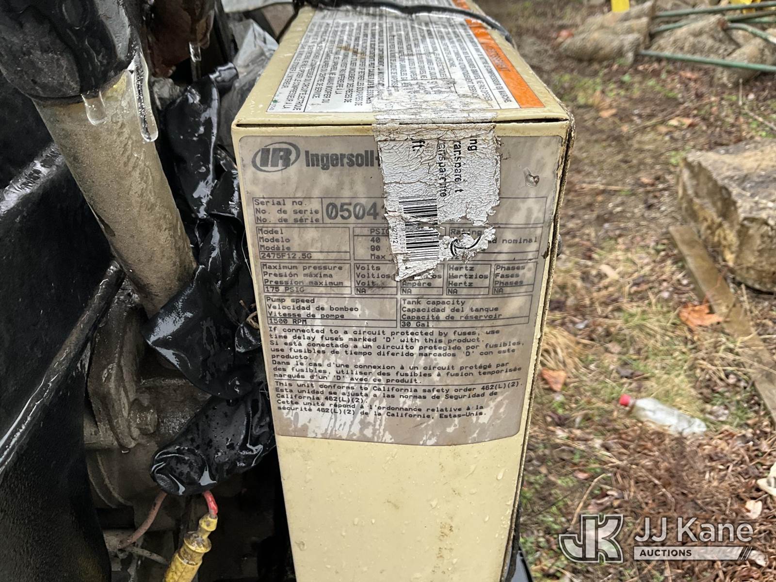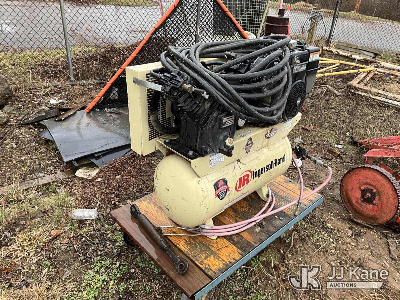 Ingersoll Rand 2475 Air Compressor, s/n 5016521, Kohler gas, with 30 gallon tank, (Not Running, Condition Unknown) (Buyer Must Load) NOTE: This unit is being sold AS IS/WHERE IS via Timed Auction and is located in Louisville, KY. For more information & removal arrangements please contact Spencer Owen @ 502-232-2541. Load Out will be by appointment only M-F; must call 24 HRS. in advance. Buyer/Hauler must present copy of paid invoice upon arrival. Purchaser acknowledges ALL lots must be removed within 5 business days of Auction, or a storage fee may be incurred. This item is used and may contain defects that are not immediately detectable. Text description and photos given are meant to be used as a guide only. The conditions are provided by the consignor; you are responsible for inspecting item before bidding. All information provided is believed to be correct but no warranty as such is either intended or implied. All items are sold AS IS - WHERE IS AND WITH ALL FAULTS AND DEFECTS THEREIN. Auctioneer Michael Whitebread / License # 256617 (Buyer is responsible for removal. Assistance by consignor or JJ Kane Auctions is not assured.)