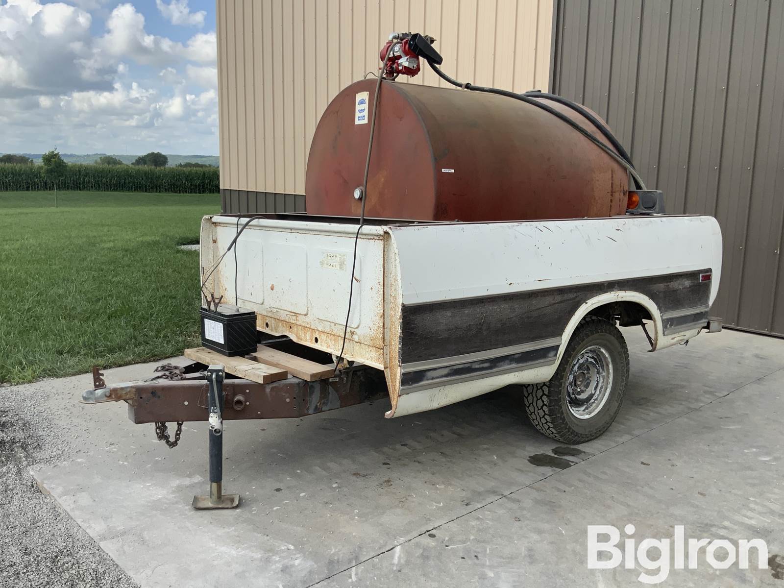 International 300 Gal Portable Pickup Box Fuel Trailer. Last Contents Was Gasoline. Tank Capacity: 300 Gallons. Bed Dimensions: 80" W X 103" L. 2" Coupler. Top Wind Trailer Jack. Leaf Spring Suspension. LT235/75R15 Tire Size. Light Kit. Includes 950 CCA JD Battery & 15 GPM Fill-Rite 12V Fuel Transfer Pump. Hose & Nozzle. Disclaimer: Visible Rust & Dents In Pickup Box & Tailgate. *Open House/Equipment Inspection Day Being Held Monday. Dec 1st 10:00am-2:00pm. Personal Inspections Available By Calling Larry @ (402) 245-7013 24 Hours In Advance. 70755 648 Ave. Falls City. NE
