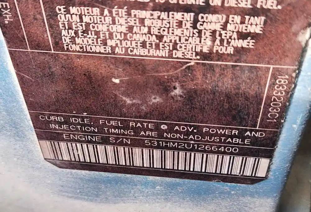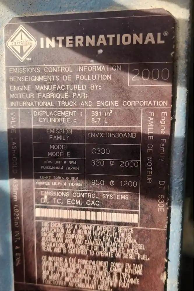 (Used) 2000 International C330, ENGINE ASSEMBLY- Family Number: YNVXH0530ANB, Displacement: 8.7L, Horsepower: 330, Serial Number: 531HM2U1266400, Part Number: 1833203C1, E.C.S: DI, TC, ECM, CAC, For more information about this item, give us a call. We ship Worldwide! (CRG HEAVY TRUCK PARTS) 929 W PULASKI HWY ELKTON, MD 21921, Serial#: 531HM2U1266400, Horse Power: 330, Casting#: 531HM2U1266400
