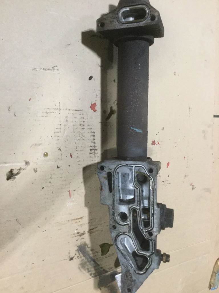 Good used, cleaned and inspected International DT 466E engine oil filter base assembly with cooler. Part number: 1817574C1.