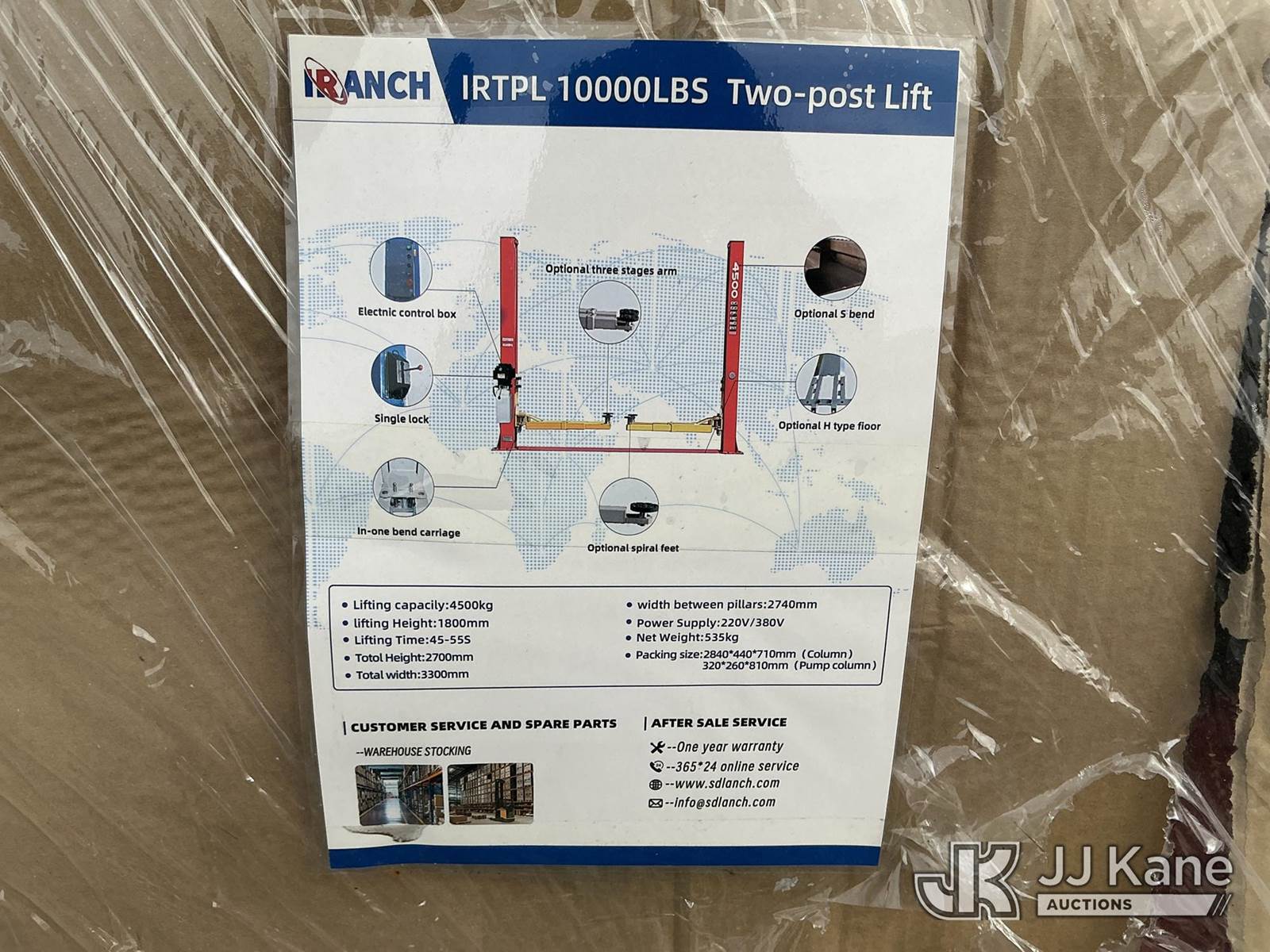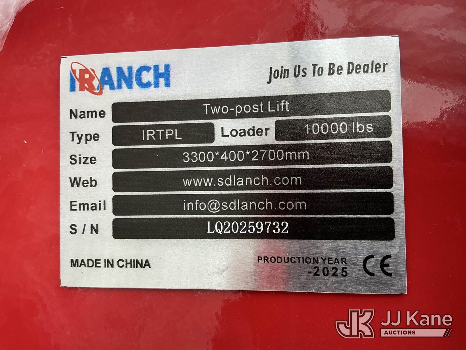 Iranch 10000LBS Two Post Lift (New/Unused) NOTE: This unit is being sold AS IS/WHERE IS via Timed Auction and is located in China Grove, NC. Inspection & preview days for this unit are the 2 business days prior to the first day of items closing for this auction, item is located at 820 E NC Hwy 152 China Grove, NC 28023 and hours of operations are 8a-4p. For pre-sale questions, please contact Office Staff @ (704) 674-1113. (Buyer is responsible for removal. Assistance by consignor or JJ Kane Auctions is not assured.)
