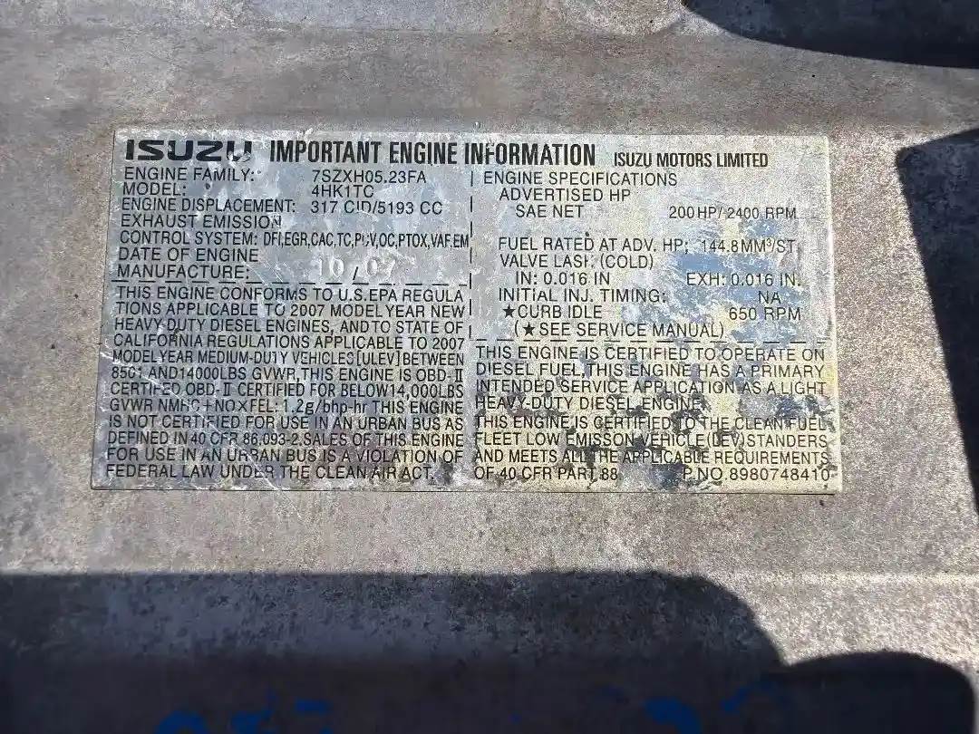 Good used Late 2007 Isuzu NPR 4HK1-TC Diesel (Engine Assembly #7SZXH05.23FA) with 186,969 miles. Call for questions on price and shipping. All parts come with a 90 day warranty. All Engines are field tested by our trusted mechanics. All Engines are drained of all fluids, cleaned, and inspected before shipping. To check availability for any of our parts, call us or visit BusbeeTruckParts.com. (Interchange: Late 2007 2008 2009 2010 Isuzu NPR NRR NQR NPR-HD Chevrolet GMC W3500 W4500 W5500 4HK1-TC Diesel)., Serial#: 7SZXH05.23FA, Core Charge: 850.00, Horse Power: 200, Casting#: 4HK1-TC