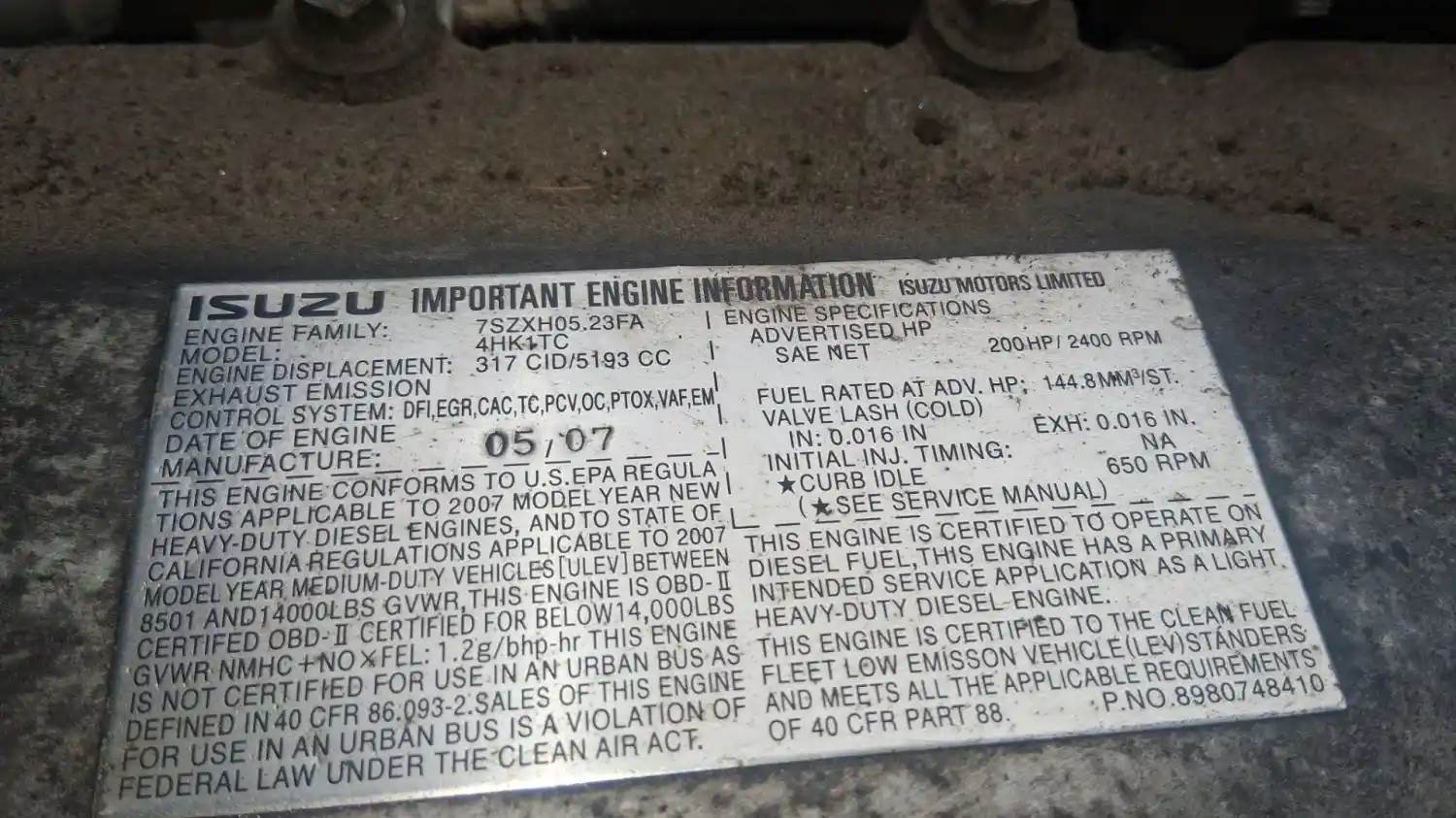 Isuzu 4HK1TC Engine for a 2007 Isuzu NPR