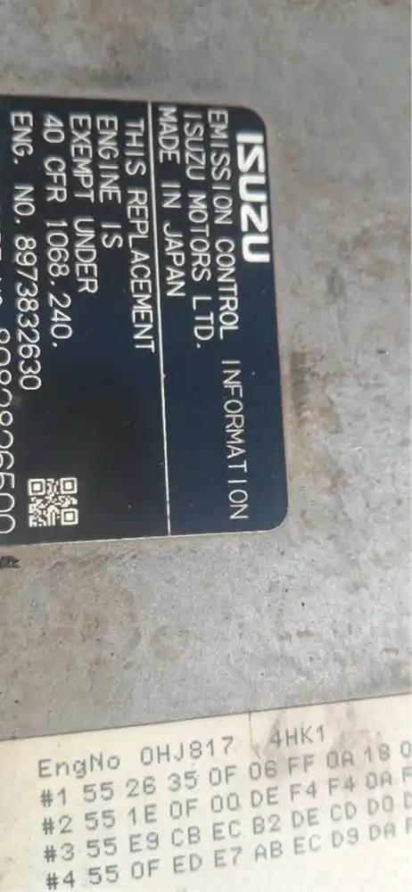 Good used Early 2007 Isuzu Nqr , 4HK1-TC engine assembly. This engine is a replacement engine from Isuzu This engine has been tested good by Mechanic Maury Furtick and has a 90 Day Warranty. This engine fits 2005 2006 Early 2007 Isuzu Npr Npr-hd Nqr Nrr and GMC/ Chevrolet W3500 W4500 W5500 models. For shipping cost call our sales team they will be happy to give you a quote or you can pick it up with no additional cost. Thanks for choosing Busbee Truck Parts, Serial#: 8973832630, Core Charge: 750.00, Horse Power: 190, Casting#: H-#5