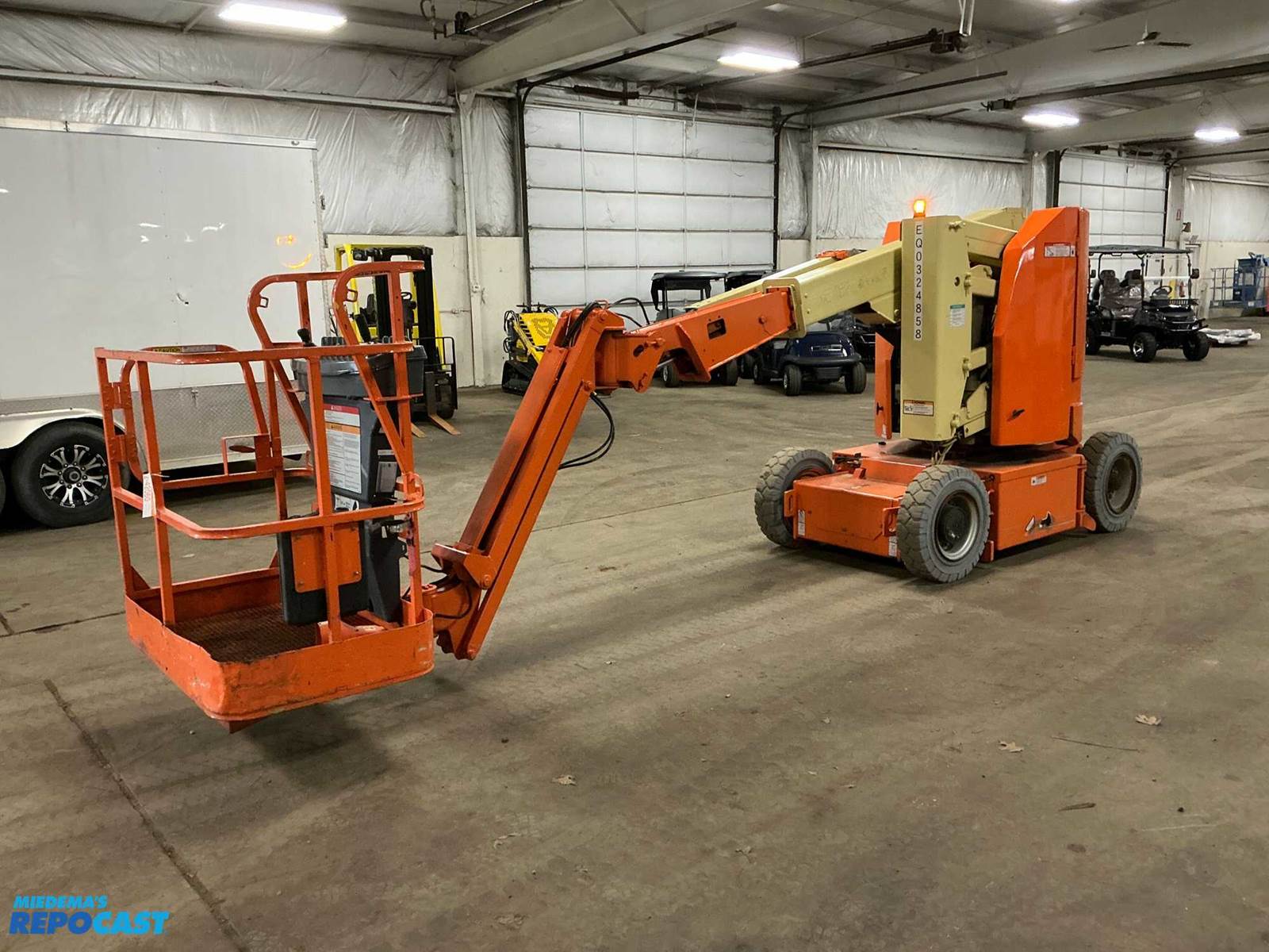 30’ Max Platform Height, 20.5’ Max Platform Reach, 500 lb Rated Capacity, 48 Volt, On-Board Charger, 25x7-12 Solid Rubber Tires, Platform Outlet, Unknown Year (Tag Reads “20”, last two digits not stamped), Works