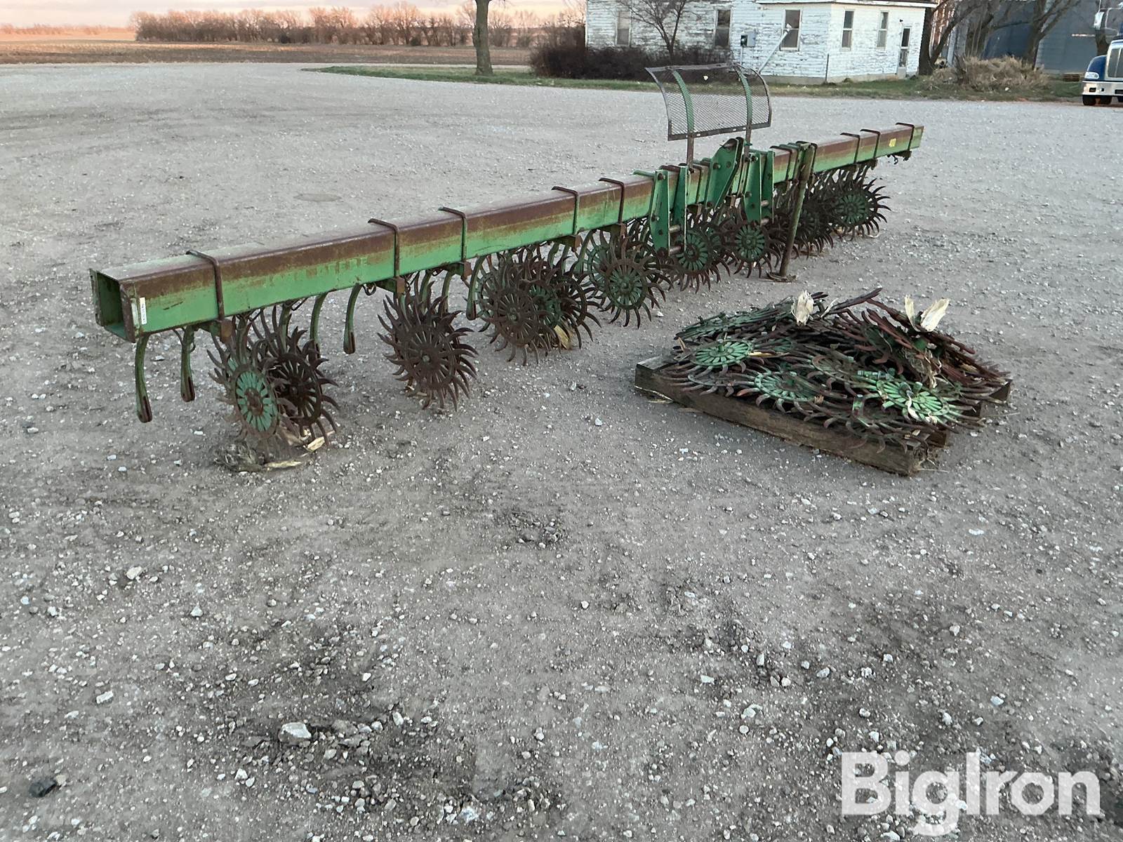 John Deere 400 Rotary Hoe, 21’ Wide, 3-Pt, 5X7 Bar, Rock Guard, Park Stand, Set Up To Run Between 8 Rows, Includes Pallet of Extra Wheels, SN: 017909