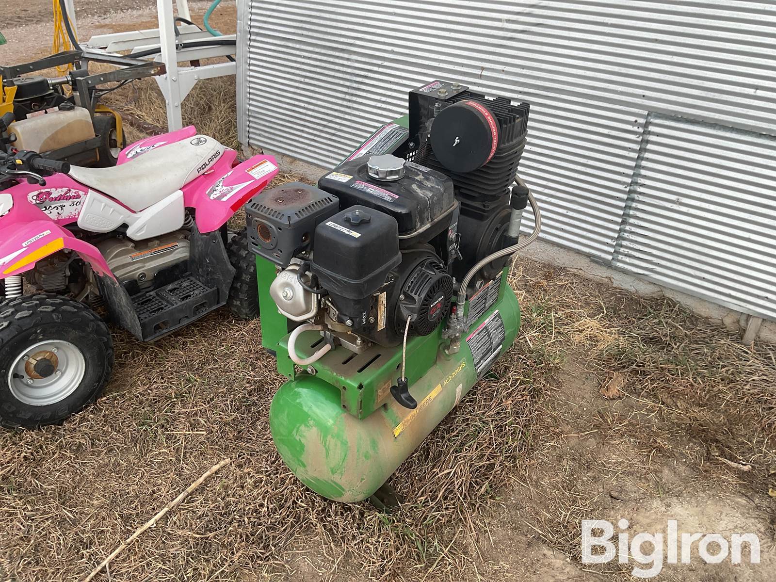 John Deere AC2-20GHS Gas Powered Air Compressor, Honda 270 cc GX Gas Engine, Electric Or Pull Start, 17.2 CFM @ 175 PSI, 20-Gal Tank, Manual Drain Valve, NOTE: Not Operational Day Of Listing, Engine Is Loose, See Video, SN: 20232829