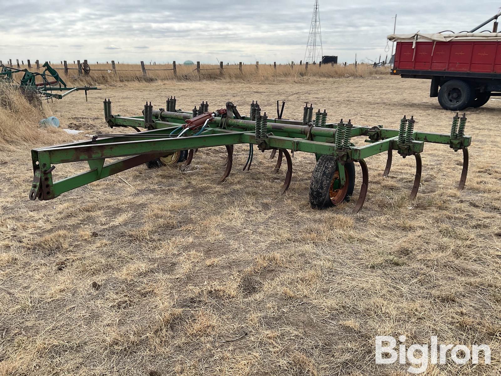 John Deere Field Cultivator, 15’ Wide, 12” Spacing, Chisel Points On Spring Shanks, (1) Pair Hydraulics, 15” Tires, Pin Hitch, Note: Tires Don’t All Hold Air