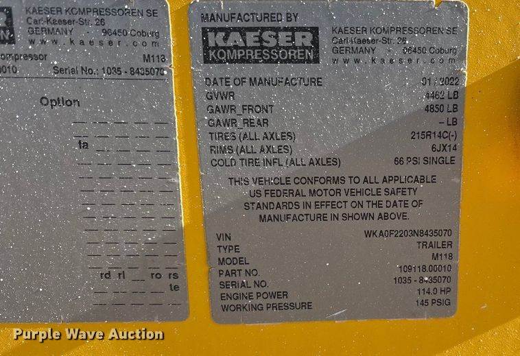 2022 Kaeser M118 air compressor, Hours: 984 on meter, VIN: WKAOF2203N8802191, Serial: 1015 - 8802191, Engine, Deutz TCD 3.6 L4, Serial:...