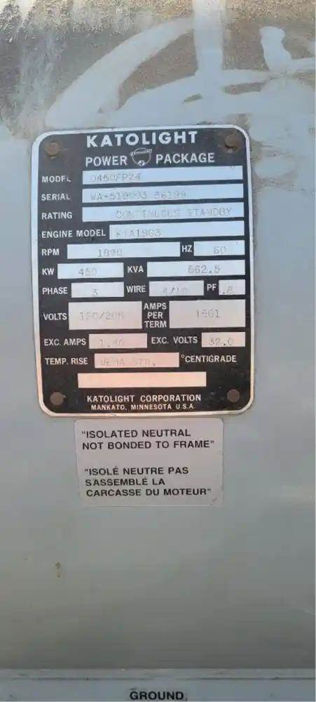 KATOLIGHT D450FPZ4 Generator, 450 KW, 562.5 KVA, Continuous Standby Rating, Cummins KTA19-G3 Engine, 685 HP, S/N 37186788, CPL-1455 412 hours. Ex PG & E Stand By unit