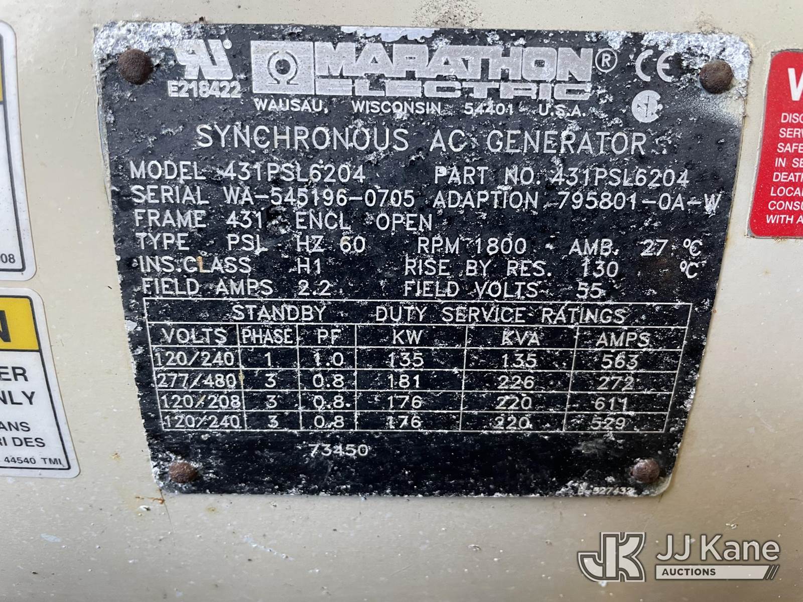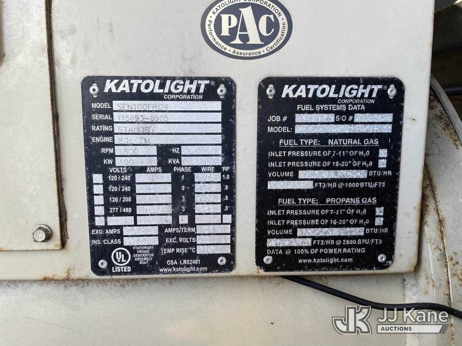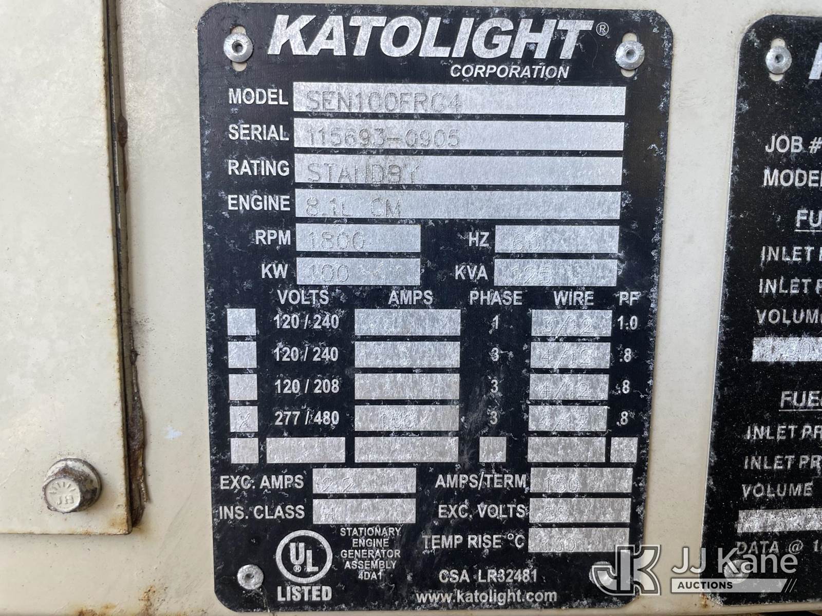 Katolight SEN100FRG4 Generator, s/n 115693-0905, Vortec LNG, 100 KW (Condition Unknown) NOTE: This unit is being sold AS IS/WHERE IS via Timed Auction and is located in Riviera Beach, FL. For pre-sale questions or to schedule an inspection, please call Gregg Martini @ 561-519-5775. Removals require 24-hr Notice by Appointment Only, Buyer/Hauler must present copy of Paid-in-Full JJ Kane Release Form upon arrival. Purchaser acknowledges ALL lots must be removed within 10 business days of Auction, or a towing & storage fee may be incurred. (Buyer is responsible for removal. Assistance by consignor or JJ Kane Auctions is not assured.)