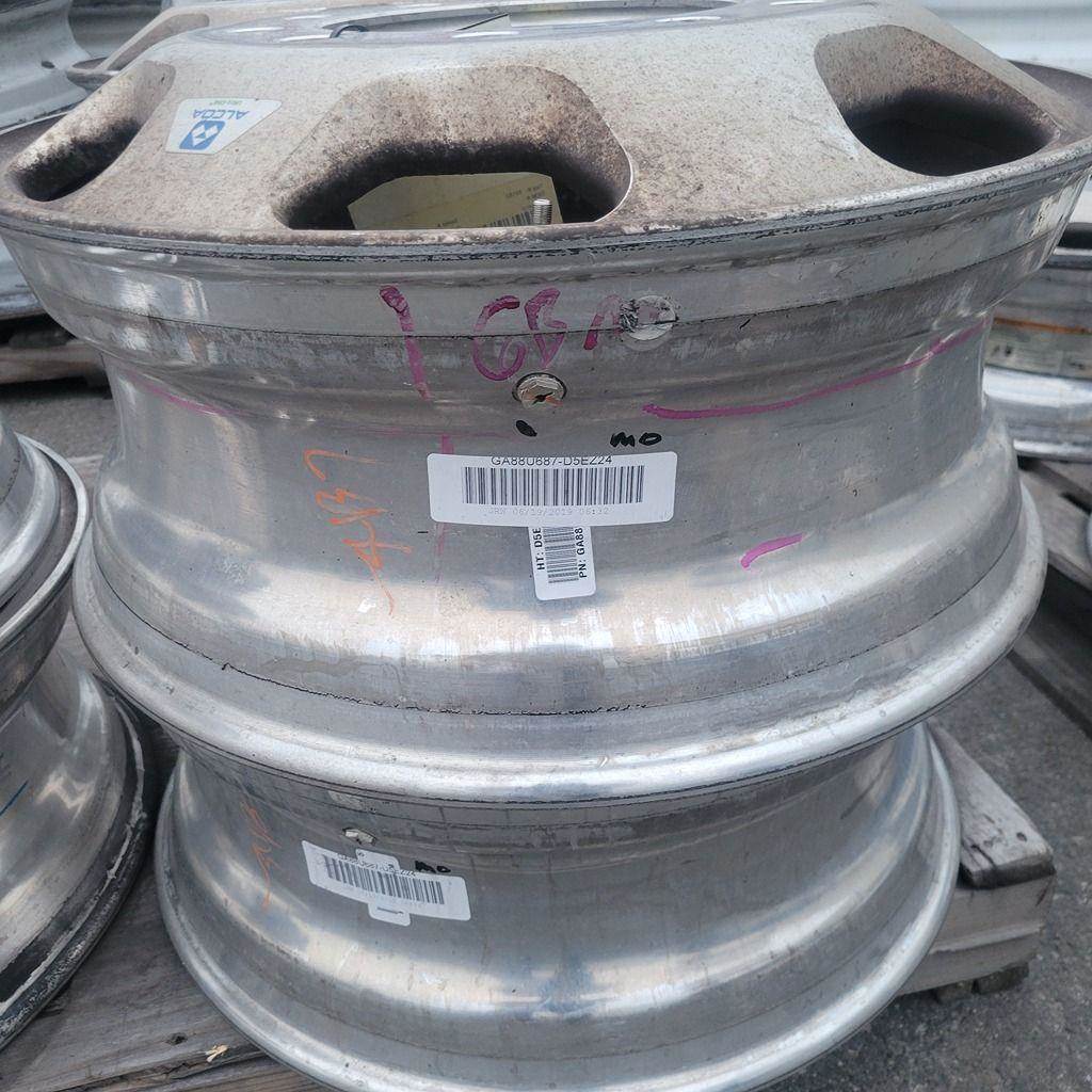 Peterbilt signature wheel from Alcoa, inner drive position, 22.5", hub-piloted mounting style. Average bead wear. Pulled from a 2005...