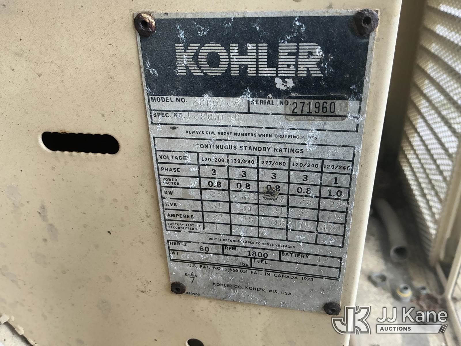 Kohler 20KW Generator, s/n 271960, diesel, State of FL Unit (Not Running, Condition Unknown) (FL Residents Purchasing Titled Items - tax, title & registration fees will be collected at the maximum rate of $400.00 under 25,999 and $800.00 for Over 26,000 and $250.00 trailers - Proof of insurance is mandatory; Out of State Residents Purchasing Title Items - tax will be collected based upon your state rate.) (Reads 1,104 hours) NOTE: This unit is being sold AS IS/WHERE IS via Timed Auction and is located in Thonotosassa, FL. Inspection & preview days for this unit are the 2 business days prior to the first day of items closing for this auction, item is located at 11720 N US 301 Thonotosassa, Fl 33592 and hours of operations are 8a-4p. For pre-sale questions, please contact Office Staff @ (813) 986-2485. (Buyer is responsible for removal. Assistance by consignor or JJ Kane Auctions is not assured.)