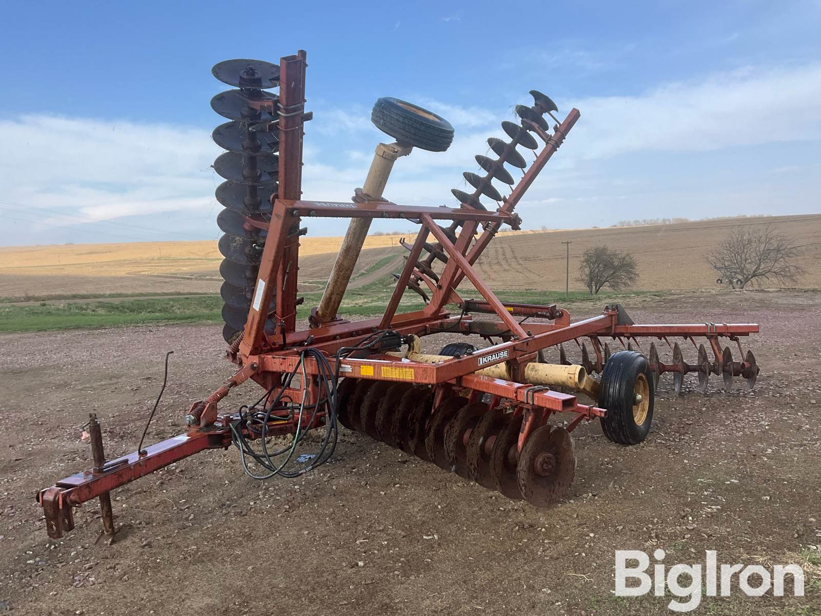 Krause 1592 15’2” Tandem Disk, Pull-Type 15'2" Working Width, Hydraulic Raise/Lower, Hydraulic Wing Fold, Hydraulic Tongue Swing, (2) Hydraulic Remotes Required, Manual Leveling, 9" Disc Spacing, Approx 21 1/8" Front Disc Diameter, Approx 21.5" Rear Disc Diameter, Disc Scrapers, Pin Hitch, Jack, 9.5L-15 Main Frame & Wing Tires, Note: Jack Is Stuck, Wing Fold Cylinder Leaks Oil, SN: 4239