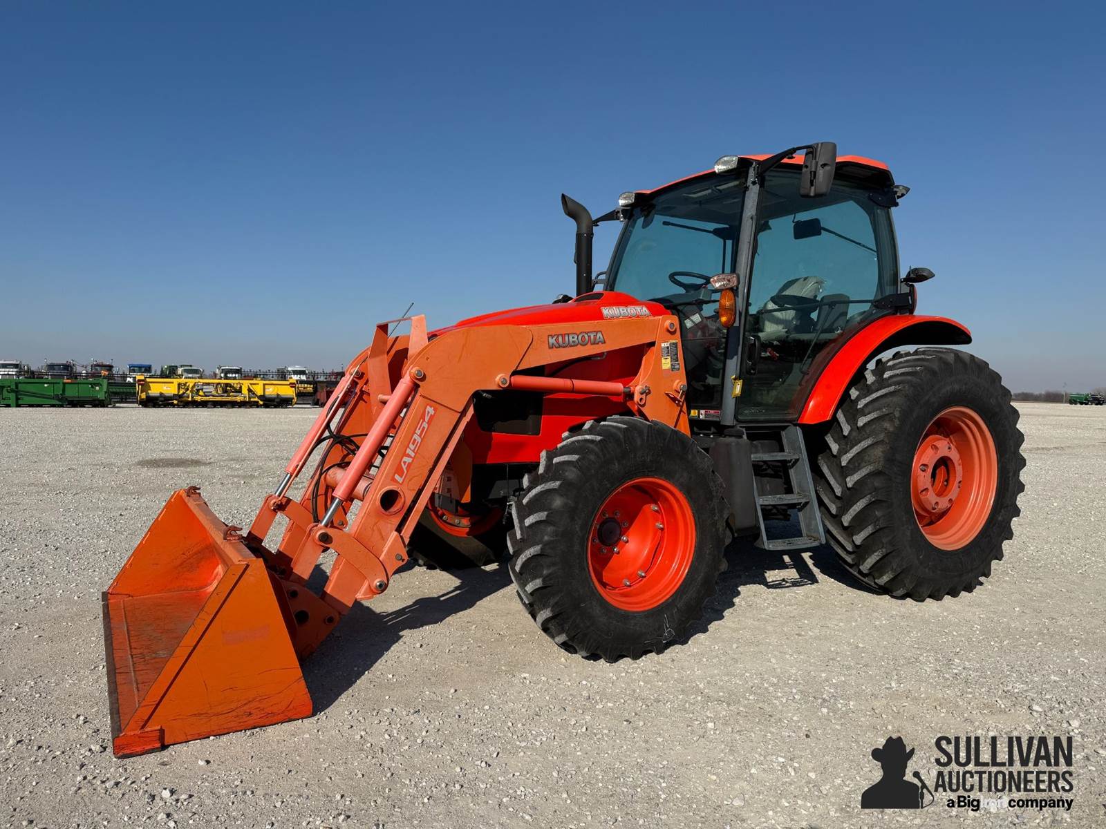 Kubota M110GX MFWD Tractor, 1,055 hrs showing, 24 Speed Partial Power Shift Transmission W/ LH reverser, 3 Hyd. Outlets, 540/1000 PTO, 3-Pt, Fender Control, 13.6R24 Front Tires, 18.4R34 Rear Tires, Rear Wheel Weights, RH & LH door, Kubota LA1954 Loader w/ 7' Material Bucket, SN: 50401