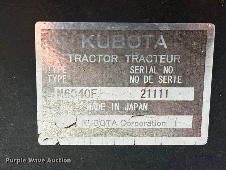 Kubota M6040 tractor, Hours: 1,525 on meter, Serial: 20032, Engine, Kubota, Cylinders: 4, Fuel type: Diesel, Transmission, Synchro, 8F -...