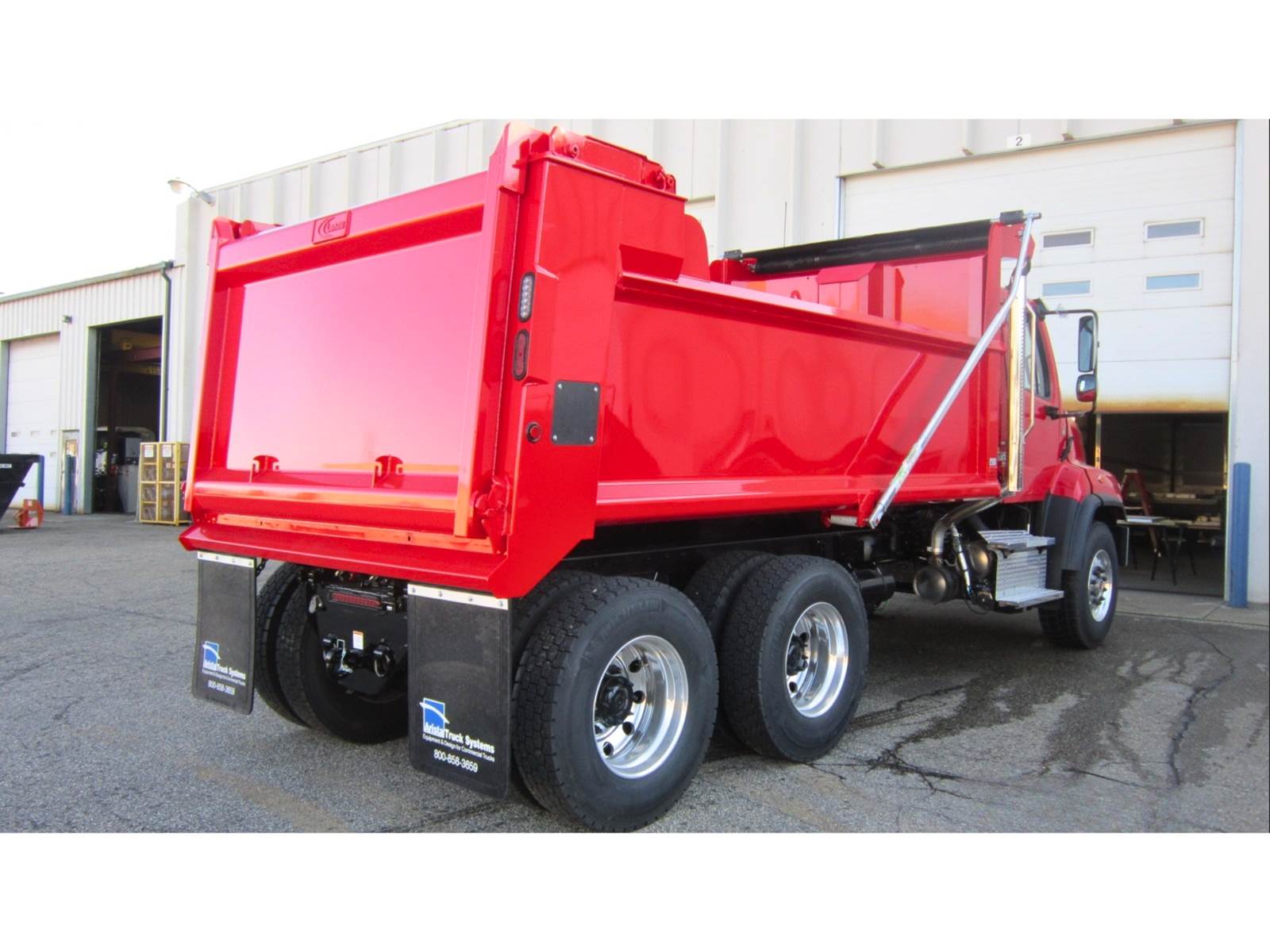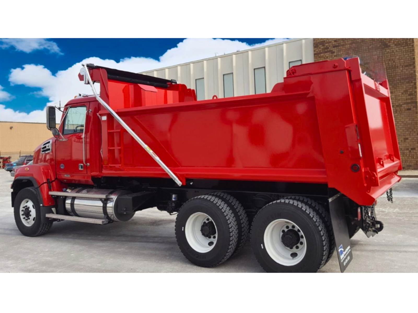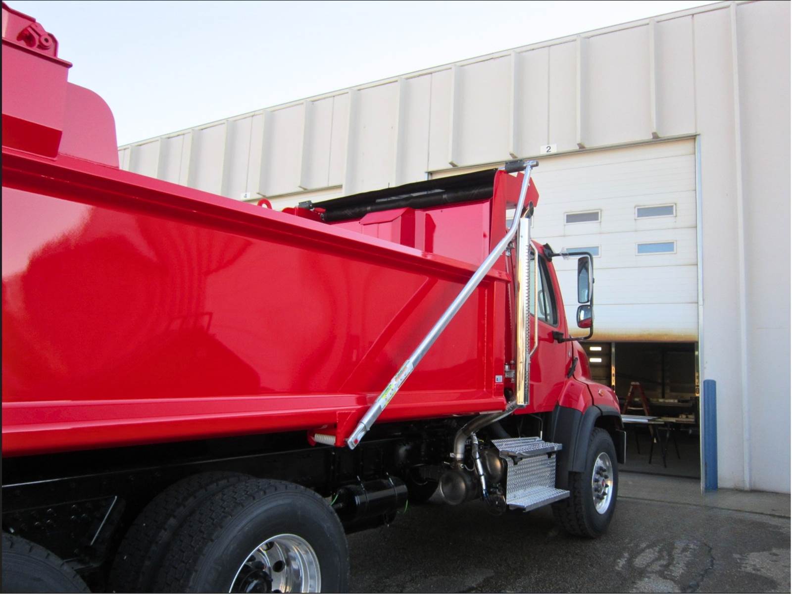 Lanau Dump Body sizes include 14 ft, 15 ft, 16 ft, and 19 ft built with SHD severe-duty Hardox steel. 450 high-strength steel on the floor, bevels on floor and wall intersections for better load release, diamond-shaped tube top rail, smooth sides, air-powered high lift tailgate, fold-down ladder and shovel hanger, integrated cab protector, paint your own color. Call us for more information!