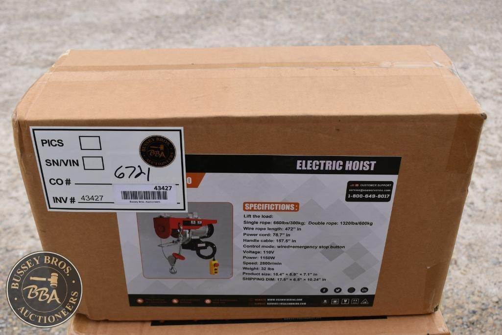 LandHero Electric Hoist Wired+emergency stop button, Input 110v, single rope - 660lb, double rope - 1320lb, NEW/UNUSED
