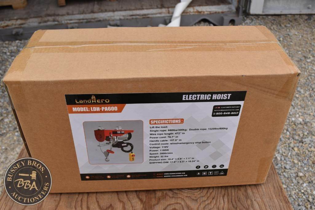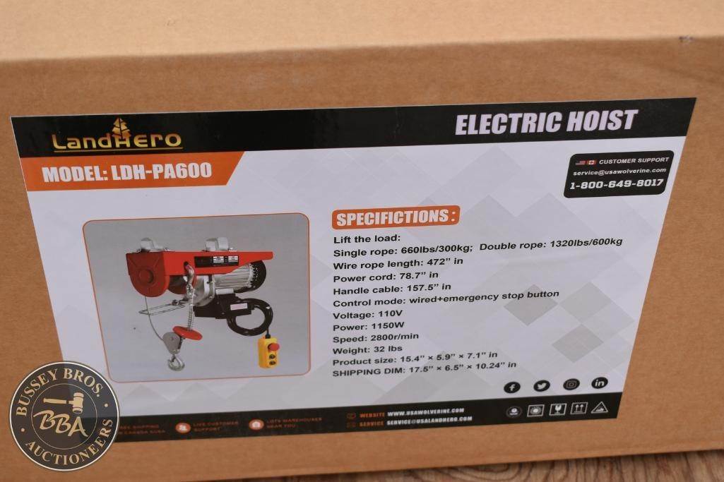 LandHero Electric Hoist Wired+emergency stop button, Input 110v, single rope - 660lb, double rope - 1320lb, NEW/UNUSED