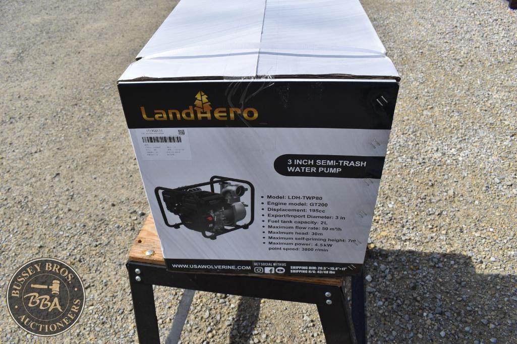 LandHero Gasoline Water Pump 3in semi-trash water pump, GT200, 195cc gas engine, max flow 50 cu me/hr, LDH-TWP80, NEW/UNUSED