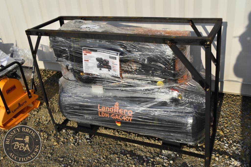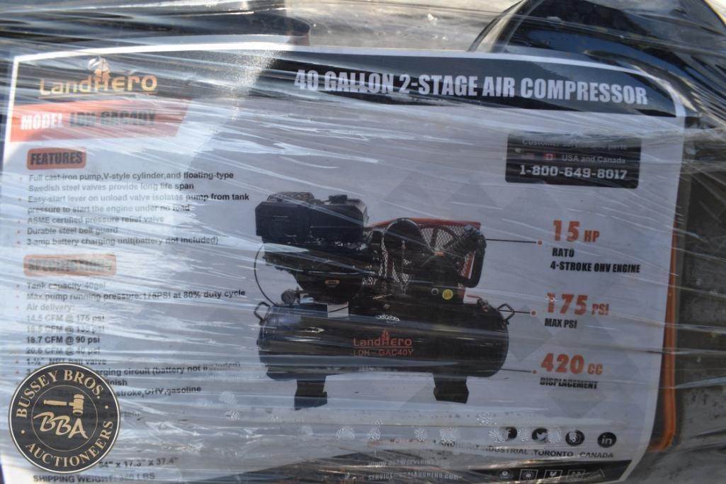LandHero LDH-GAC40Y, 2-Stage Air Compressor, 15 HP, 40 Gallons, 175 PSI, 4-Stroke OHV Engine, 420 CC, Gas Power Source, Approx. Dimensions: 55 x 20 x 44 inches (140 x 50 x 112 cm), Approx. Weight: 350 lbs (158 kg), Additional Features: Two-cylinder pump, V-style cylinder, Floating-type tank drain valve, Cast iron pump.