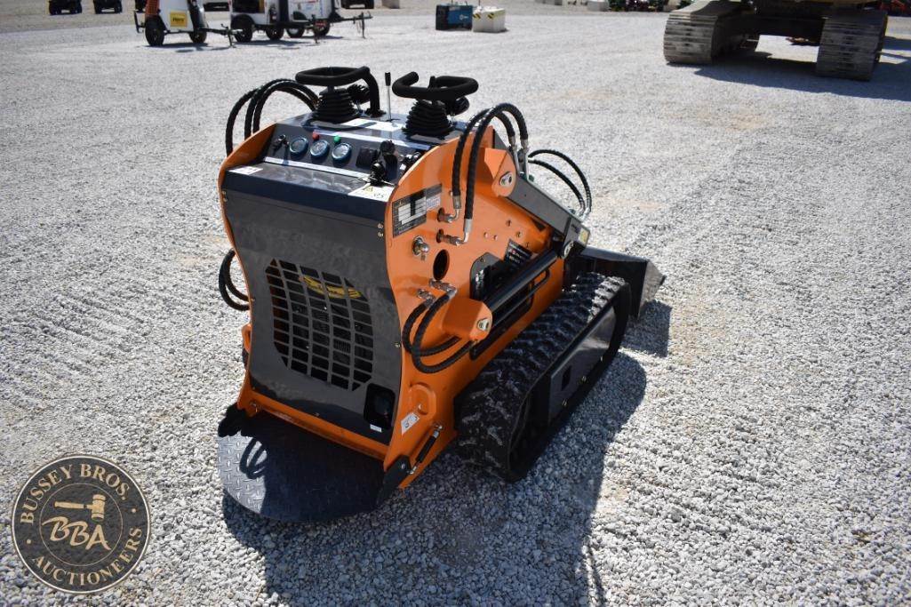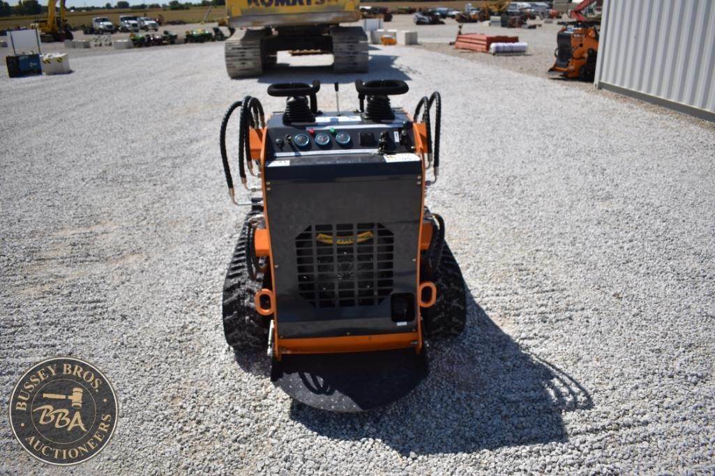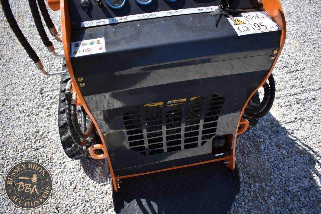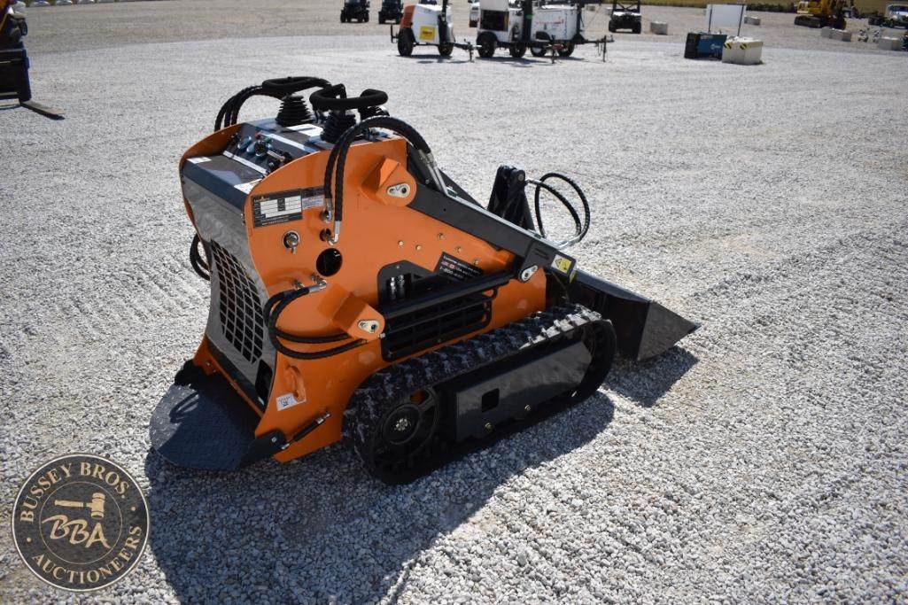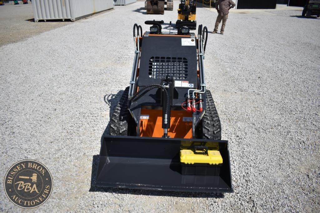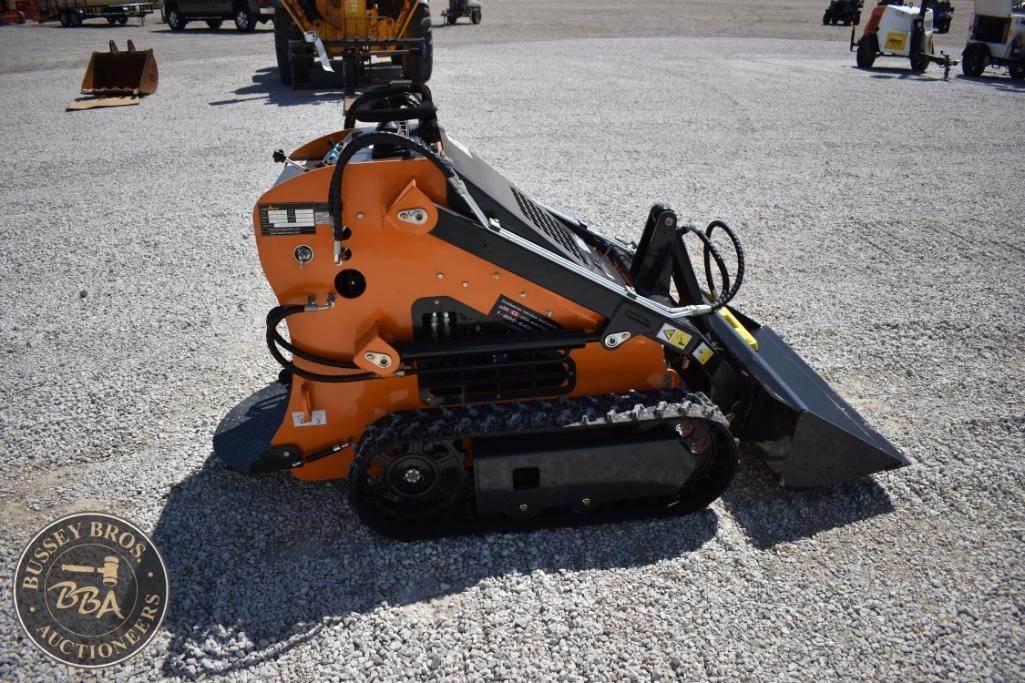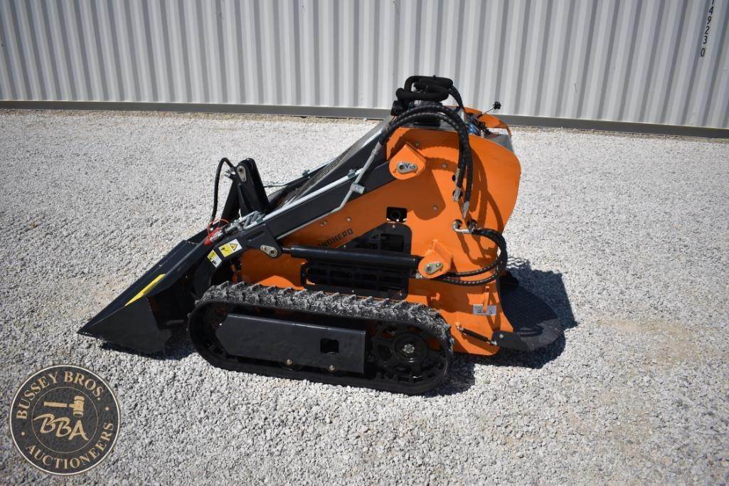 Landhero Mini Skid Steer Loader, features include 24.8 HP Kubota D902 Diesel Engine, 600 lbs operating load, 1,735 lbs tipping load, 12 GPM hydraulic flow, standard bucket, stand-on controls, rubber tracks.