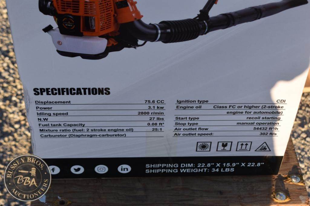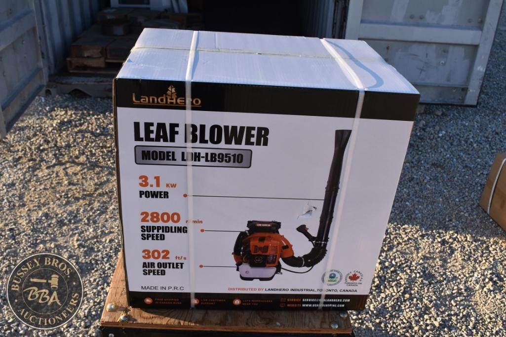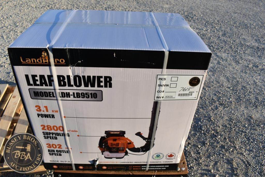 LandHero LHB9510 Leaf Blower, features: 75.6 cc engine displacement, 3.1 kW power output, 2800 rpm idling speed, 0.08 gal fuel tank capacity, 25:1 fuel mix ratio, CDI ignition, Class FC or higher engine oil type, shipping dimensions 22.8 in x 15.2 in x 22.8 in, shipping weight 34 lbs, Serial Number: 7615.