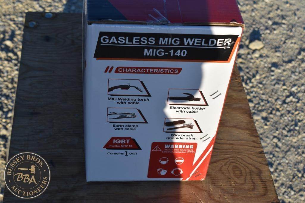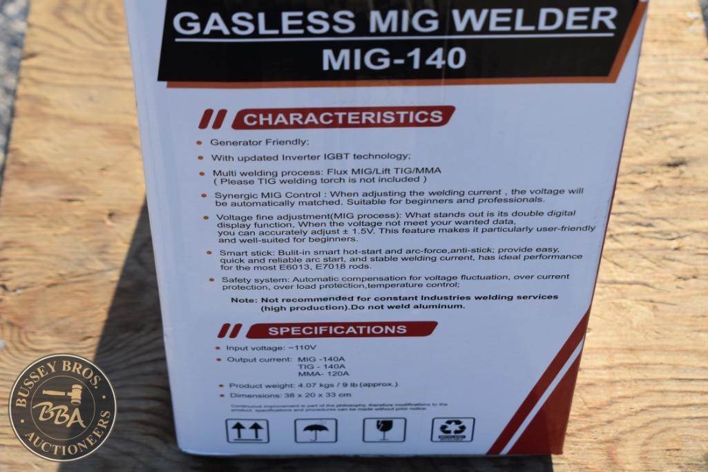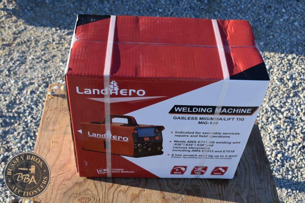LandHero MIG-140 Gasless MIG Welder, supports Flux MIG/LIFT TIG/MMA, compatible wire sizes 0.030"/0.035"/0.039", includes electrode holder with cable, earth clamp with cable, and wire brush.