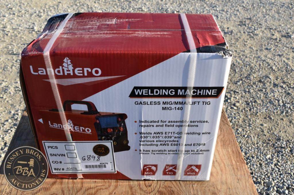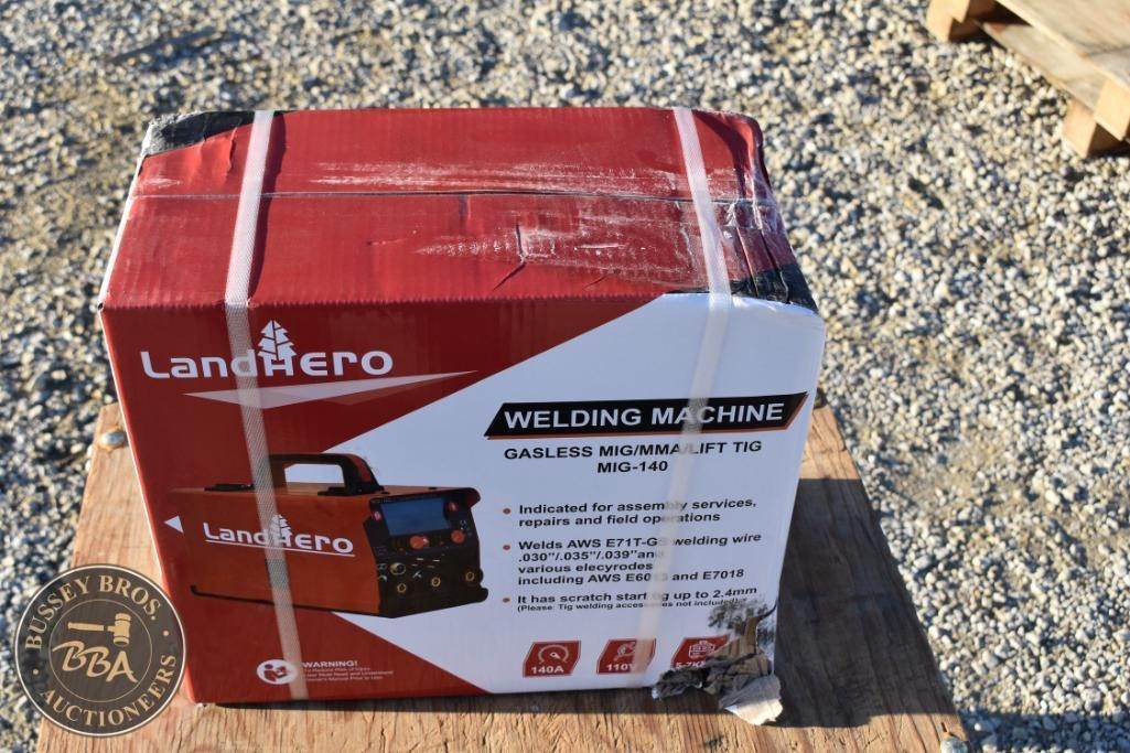 LandHero MIG-140 Welding Machine, Gasless MIG/MMA/Lift TIG, Output Current Range 30-140A, Input Voltage 110V, Duty Cycle 60% @ 140A, Wire Feed Speed Range 50-500 in/min, Compatible Wire Sizes up to 2.4mm, Additional Features: Welds AWS E71T-GS welding wire 0.30"/0.35"/0.39",