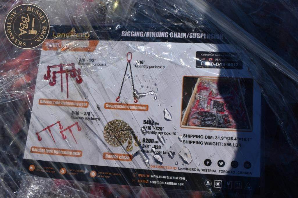 LandHero Rigging/Binding Chain/Suspension Lot Ratchet type (Five 3/8-1/2in; Eight - 5/16-3/8in), Suspension Equip (Eight - 5/16in), Bundle Chain (Sixteen - 5/16in x 20ft; Ten - 3/8in x 20ft), NEW/UNUSED