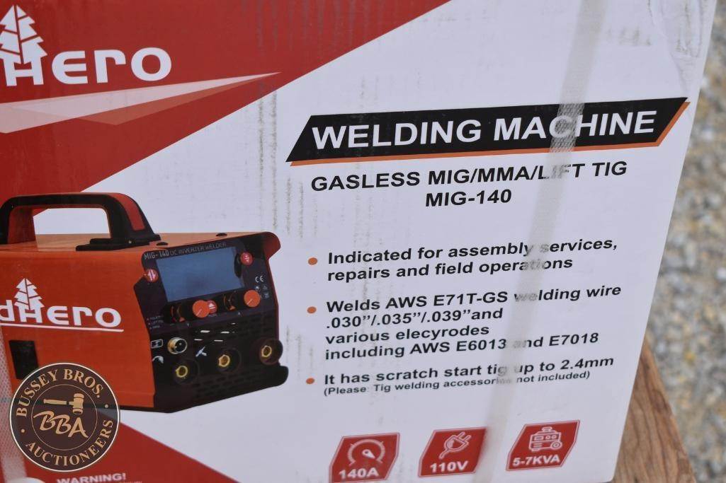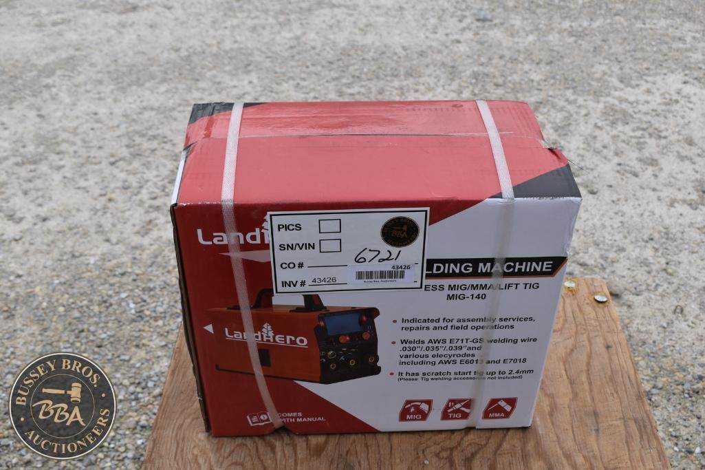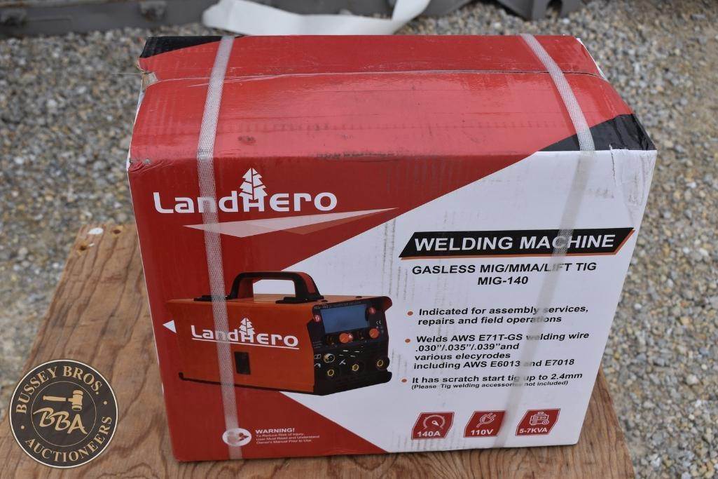 LandHero Welding Machine Gasless, Flux MIG/Lift TIG/MMA, Input 110v, MIG torch w/cable, Electrode holder w/cable, Earth clamp w/cable, NEW/UNUSED
