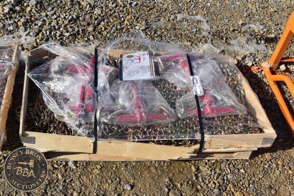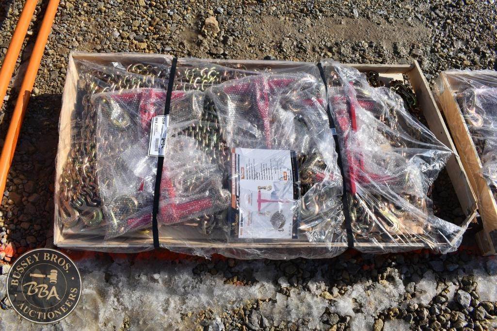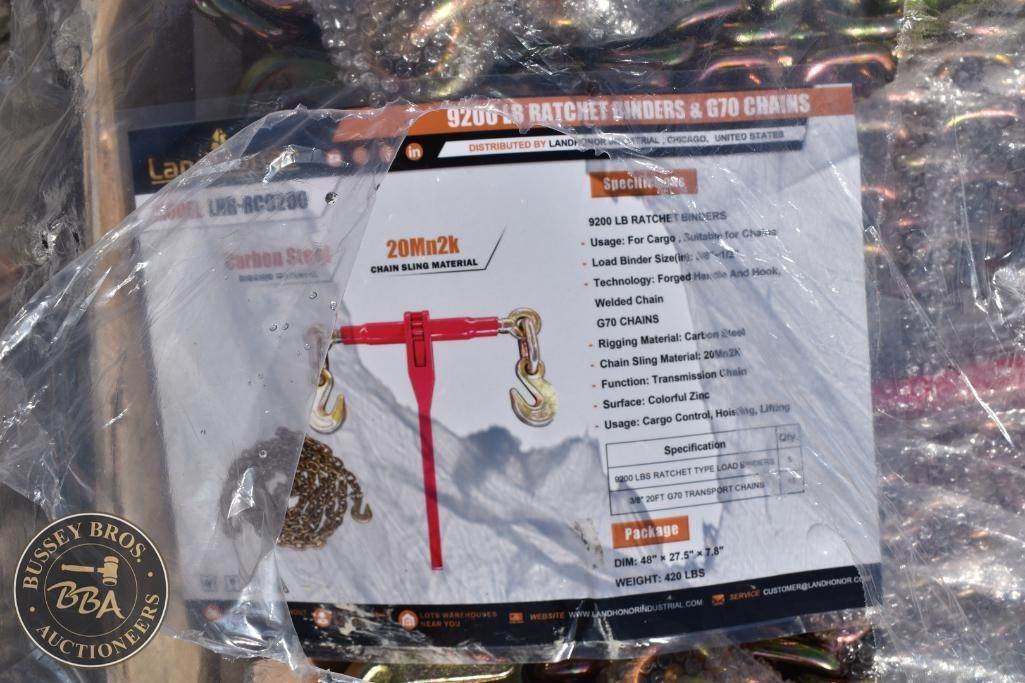 Landhonor 3/8 Chains and Binders lot contains 5-9200lb capacity ratchet binders, and 10 20ft-3/8inch chains, NEW/UNUSED