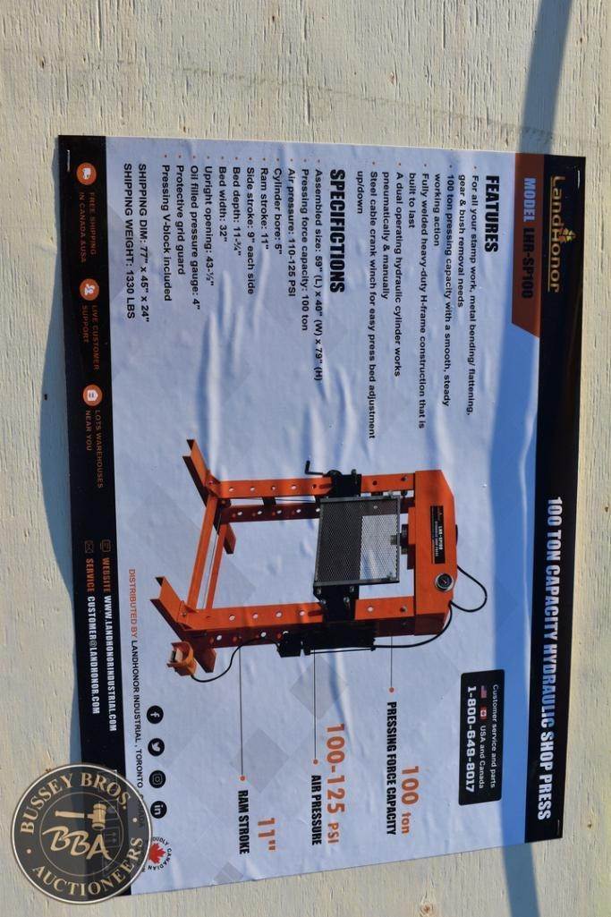 Landhonor Hydraulic Shop Press 100 Ton Capacity 100-125 PSI 11 Inch Ram Stroke NEW/UNUSED